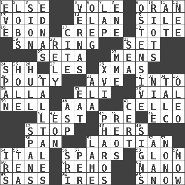 ACROSS 1. Otherwise 5. Short-tailed, large-bodied rat 9. NW Algerian seaport 13. Nothingness 14. Liveliness 15. Filth; sediment 16. Inky black, to poets 17. Streamer paper 18. Carry 19. Catching in a trap 21. Put into a specified state 22. Bristle 23. Not women's 24. Quiet! 27. French article 28. Dec. holiday 29. Marked by pouting 31. "___ Maria" 32. To the inside or interior of 36. Silent film actress Nazimova 37. Connecticut Ivy Leaguer 38. Small bottle 39. 1994 drama film starring Jodie Foster 40. Auto club (abbr.) 41. Cell (Danish) 42. For fear that 44. Before (prefix) 46. Environmental prefix 47. Constrict 48. Possessive pronoun 50. Baking dish 51. Of or relating to Laos or its people 54. Slanted text style (abbr.) 56. Practice fights 58. Seize upon or latch onto something 60. French philosopher Descartes 61. San ____ (Riviera town) 62. Billionth: prefix 63. Backtalk 64. Angers 65. Frozen precipitation DOWN 1. First lady 2. Tennis shots 3. The Jewish people; Israel 4. Ferber et al. 5. Actresses Bloom and Felton 6. Cassini of fashion 7. Infant locale 8. Compass dir. 9. Clearly or manifestly demonstrative 10. Disturbances 11. The first octave above the treble staff 12. Born 17. Quote 20. Have trust in 21. Ocean 23. Madame (abbr.) 24. Connect, as a bridge 25. Opening into or through something 26. Frame or body of a ship 28. 16 30. Baron Munchausen's specialties 31. Chicken ___ king 33. "Death on the ____" 34. Baby powder 35. Margarine 37. Erode 40. Cleo's killer 41. Foregone conclusion 43. Period of immesurable duration 44. N Egypt peninsula 45. Vintage cars 47. Connects, as a bridge 49. Signals 51. Unable to walk 52. Actor Alda or Thicke 53. Words to Nanette 54. Big collection agency 55. Beverage made from leaves 56. _ Lanka 57. For each 59. Cut the grass