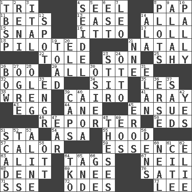 ACROSS 1. Three (prefix) 4. Sew up the eyelids of hawks and falcons 8. Infant food 11. Antes 13. Relaxation 14. Silent film actress Nazimova 15. Fastener 16. "Tell ____ the Marines!" 17. Hang loosely or laxly 18. Manned the helm 21. Relating to or accompanying birth 22. Lacquered or enameled metalware 23. Manchild 25. Like a shrinking violet 26. Sometimes accompanies a hiss 29. One to whom something is allotted 32. Stared 34. Be seated 35. French article 38. Songbird 39. Capital of Egypt 41. Like ___ of sunshine 43. Oval reproductive body of a fowl 44. A saturated hydrocarbon 45. Take place subsequently 46. Newsperson 50. Begley and Asner 51. R.R. building 54. White ___ sheet 55. Parka part 57. Bodily heat indicating an inflammation 59. Gist 63. Set down 64. Labels 67. Famous astronaut Armstrong 68. Undesirable depression on a surface 69. Leg joint 70. Suttee (variant) 71. Compass dir. 72. Lyric poems 73. Area sheltered from the wind DOWN 1. Cook's measure (abbr.) 2. Painter Guido (1575-1642) 3. Slanted text style (abbr.) 4. A glass for beer 5. Erode 6. Eastern Standard Time (abbr.) 7. Lion 8. Schemes 9. Assad's deity 10. Chummy 12. Specific locale 14. In the manner of 19. Frog relative 20. Pipe bend 21. Compass dir. 23. Use a swizzle stick 24. "Beetle Bailey" pooch 26. Ribbon knot 27. Legendary monster 28. Cassini of fashion 30. Flexible twig of a willow tree 31. Enthusiasm 33. Engineer (abbr.) 36. Celtic language 37. Saudi Arabian king (1953-1964) 39. Balmoral and tarboosh 40. Small Philippine buffalo 42. Affirmative reply 45. Greek god of love 47. Hearing organ 48. College papers 49. Greek goddess of the dawn 51. Loads 52. Stories 53. Place in a line 56. Cub Scout units 58. Baseball player Mel 60. Be tempered by heat 61. Quote 62. Writer Wiesel 64. Ring climax 65. Added to 66. Unit of force equal to gravity