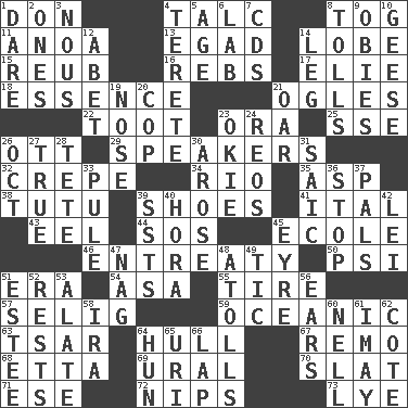 ACROSS 1. Spanish title 4. Baby powder 8. Coat; cloak 11. Small Philippine buffalo 13. Mild oath 14. Ear part 15. Reuben's nickname 16. Confederate soldiers (slang) 17. Writer Wiesel 18. Gist 21. Stares at amorously 22. A blast of a horn 23. Mouth or opening 25. Compass dir. 26. Baseball player Mel 29. Orators 32. Streamer paper 34. _ de Janeiro 35. Viper 38. Ballerina skirt 39. Imelda's hoard 41. Slanted text style (abbr.) 43. Snakelike fish 44. Distress signal 45. Learning spot: Fr. 46. Plea 50. 23rd letter of the Greek alphabet 51. Epoch 54. White ___ sheet 55. Hoop that covers a wheel 57. Major League Baseball Commissioner Bud 59. Pertaining to the sea 63. Russian ruler of old 64. Frame or body of a ship 67. San ____ (Riviera town) 68. Singer James 69. Mountain range 70. Narrow board 71. Compass dir. 72. Cuts off 73. Potassium hydroxide DOWN 1. Have the gumption 2. Singles 3. Horse sense 4. Cigar-shaped 5. Grow older 6. Experiment locale 7. Music discs 8. For Whom the Bell _____ 9. Off-Broadway awards 10. Honkers 12. Collude with 14. Part of a journey 19. Characteristic smell of wine 20. Police officer (slang) 21. Rowing implement 23. Migrant worker of the '30s 24. Vintage cars 26. Sep. follower 27. Loyal 28. False hair 30. Came up 31. Ketch in the Levant 33. Whimper 36. Constrict 37. Friends 39. Fast planes 40. Israeli folk dance 42. Luau accessory 45. Jane of fiction 47. Tired old horse 48. Ringlike coral islands and reefs 49. Nervous spasm 51. First name in cosmetics 52. Musical pauses 53. Having winglike extensions 56. Hearing organs 58. Lyricist Gershwin 60. 1994 drama film starring Jodie Foster 61. "If ____ say so..." 62. ____ d'Azur (French Riviera) 64. Attila the _ 65. RI univ. 66. Infant locale