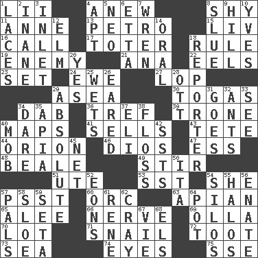 ACROSS 1. Cards in a Roman deck? 4. Afresh 8. Like a shrinking violet 11. Queen of England 1702-14 13. Stone: prefix 15. 54 in ancient Rome 16. Give a ring to 17. Carrier 18. Governing power 19. Foe 21. Santa ___, CA 22. Snakelike fish 23. Arrange properly for use 24. She-sheep 27. Trim (branches) 29. Toward the sea 30. Ancient Roman robes 34. Small moist lump or mass 36. Not kosher 39. Marketplace scale 40. Atlas contents 41. Exchanges for money 43. False hair 44. Constellation of myth 46. "Vaya con ____" 47. Double-curved letter 48. Calif. Air Force Base 49. Commotion 51. Shoshoni 53. Fast jet (abbr.) 54. A female animal or person 57. Inconspicuous attention getter 60. The grampus (Milton) 63. Bee-related 65. Toward shelter 66. Impudent aggressiveness 69. Spanish pot 70. Car dealer's back yard 71. Slow-paced one 72. A blast of a horn 73. Ocean 74. Snake ____ (dice throw) 75. Compass dir. DOWN 1. Shoestrings 2. Empty; void 3. An arm off of a larger body of water 4. Fitting 5. Modern: prefix 6. Singer James 7. Songbird 8. Change direction abruptly 9. Land elevation 10. Jacques Cousteau's middle name 12. Shade tree 14. Taken by mouth 18. Newsperson 20. Consenting reply 25. Moistens 26. Having ears or earlike features 28. Baseball player Mel 29. Utter; complete 31. Travels 32. Pismires 33. Perceive with the eye 34. Have the gumption 35. Capital of Western Samoa 37. Connecticut Ivy Leaguer 38. Soft thread for cleaning between teeth 40. Disorderly crowd 42. Fast planes 45. Remaining after all deductions 50. Call ___ day 52. Immeasurably long periods of time 54. Grain storage towers 55. Radiant circles of light 56. Maternal 57. Friends 58. _ gin 59. Bristle 61. French philosopher Descartes 62. Supercomputer manufacturer 64. Cooking vessel 67. Compete 68. Raised railways