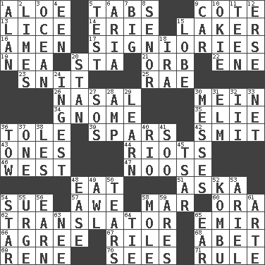 ACROSS 1. _ vera 5. Bar bills 9. ____ d'Azur (French Riviera) 13. Louse (plural) 14. One of the Great Lakes 15. Member of a famous L.A. basketball team 16. So be it 17. Seigniories (variant) 19. Teachers' org. 20. R.R. building 21. Globe 22. Compass dir. 23. In a ____ (agitated or irritated) 25. Actress Charlotte 26. Relating to the nose 30. Chow _ 34. Dwarf 35. Writer Wiesel 36. Lacquered or enameled metalware 39. Practice fights 42. Stricken, poetically 43. Washington bills 44. Disturbances 46. 270 degrees 47. Trap for birds or small mammals 48. Ingest 51. "____ silly question..." 54. Take to court 57. Deep reverence 58. Third mo. 60. Mouth or opening 62. Interpreter 65. Arab leader 66. Match 67. Cause heat under the collar 68. Collude with 69. French philosopher Descartes 70. Perceives with the eye 71. Court order DOWN 1. Actor Alda or Thicke 2. Citrus fruits 3. Sea 4. Car or cant ending 5. Trial 6. Operatic vocal solo 7. Massive 8. Sir (Sp.) 9. Auto 10. Migrant worker of the '30s 11. Adolescent 12. Celtic language 15. Ear part 18. Retirement account (abbr.) 20. Comedian Laurel of Laurel & Hardy 24. Consume 27. Distress signal 28. Electrical Unit 29. Acquire or gain knowledge or skills 30. Makes clutter 31. Shade tree 32. One more than two 33. Remaining after all deductions 36. Pull behind 37. Single 38. French article 40. River (Sp.) 41. "Barney Miller" actor Jack 45. Russian ruler of old 48. Comfort 49. Leather borer 50. Separates forcefully 52. Dried seaweed eaten as food 53. Satellite of Uranus 54. Play the lead 55. Goad 56. Merit 58. Undercover agent 59. Ancient Greek god of war 61. Johnson of "Laugh-In" 63. Born 64. Make a knot 65. Ewer handle