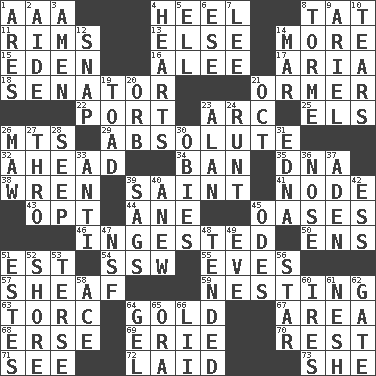 ACROSS 1. American Automobile Association (abbr.) 4. The bottom of a shoe or boot 8. Make lace 11. Basketball hoops 13. Otherwise 14. Greater amount 15. Paradise 16. Toward shelter 17. Roberta Peters solo 18. Elected representative 21. Channel Islands abalone 22. Sweet dark-red dessert wine 23. Curve 25. Raised railways 26. Mountains (abbr.) 29. Utter; complete 32. Having the leading position 34. Bar 35. Heredity factor (abbr.) 38. Songbird 39. Virtuous person 41. Connecting point 43. Elect 44. One (Scot) 45. Fertile tracts in a desert 46. Swallowed 50. Followers of ems 51. Eastern Standard Time (abbr.) 54. Compass dir. 55. Nights before holidays 57. Bundle of cut stalks of grain 59. Snuggling 63. Torque (variant) 64. Gilt 67. Type of rug 68. Celtic language 69. 4th largest of the Great Lakes 70. Remainder 71. Perceive with the eye 72. Put down 73. A female animal or person DOWN 1. Ancient Greek god of war 2. Assistant 3. So be it 4. Centers 5. Pipe bend 6. Compass dir. 7. Area sheltered from the wind 8. Singer Mel 9. Satellite of Uranus 10. Pulls apart 12. Fastener 14. Impair 19. Frog relative 20. Globe 21. Sep. follower 23. Actor Alda or Thicke 24. Undersized animal 26. Opening into something insatiable 27. Through, poetically 28. Ooze 30. Off-Broadway awards 31. Pulitzer Prize-winning author Ferber 33. Opposed to 36. Sense of smell 37. Arabian gulf 39. Droops 40. Afresh 42. Double-curved letter 45. Lyric poems 47. Overdraft (abbr.) 48. Looked after 49. First lady 51. _____ Park, CO 52. Dinah or Pauly 53. Laconic 56. Play the lead 58. Adept person 60. Angers 61. Delicate 62. Yard entry 64. Set 65. Mouth or opening 66. Cards in a Roman deck?
