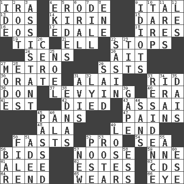 ACROSS 1. Lyricist Gershwin 4. Wear away 9. Slanted text style (abbr.) 13. Two (Sp.) 14. Japanese brewing company 15. Have the gumption 16. Greek goddess of the dawn 17. Peak District village in England 18. Angers 19. Nervous spasm 21. Pipe bend 22. Obstructs or blocks passage 24. Elected reps. 26. Small island 27. Paris' subway 29. Fast planes 30. Speak pompously 31. Jai ____ 33. To free from 36. Spanish title 37. Imposing or collecting, as a tax 40. Epoch 41. Eastern Standard Time (abbr.) 42. Passed on 43. Slender Brazilian palm 45. Baking dishes 47. Aches 48. Insect wing 49. Grant temporary use of 50. Goes without food and/or water 52. Adept person 54. Ocean 56. Auction offers 57. Trap for birds or small mammals 59. Compass dir. 61. Toward shelter 62. _____ Park, CO 63. Music discs 64. Tear apart 65. Puts on (as clothing) 66. Sight organ DOWN 1. Binary compound 2. Carrot, for example 3. Helper 4. Make supply last 5. Amusement-park features 6. Taken by mouth 7. Deli pickle 8. Compass dir. 9. Foolish or stupid persons 10. Canvas cover 11. Ancient Greek god of war 12. French article 20. Foregone conclusion 22. Indian antelope 23. Teat (slang) 25. Christmas carol 27. Method 28. Greek god of love 29. Expressed in words 31. Opinion 32. Sodium hydroxide 33. Home 34. SW Asia republic 35. Raised platform 38. Ferber et al. 39. Yawn 44. Without 45. Went by 46. Keyboard modifier key 49. Failure 50. Do some clerical work 51. An important port of Yemen 52. Airs 53. Round or rotation of duties 55. "60 Minutes" Commentator Rooney 56. Drinking establishment 57. ___ Haven, CT 58. Double-curved letter 60. Compass dir.
