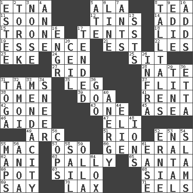 ACROSS 1. Inactive volcano in Sicily 5. Chicken ___ king 8. Beverage made from leaves 11. Within a short period 12. Airtight sealed metal containers 14. Find the sum of 15. Heavy duty weighing machine 17. Portable shelters 18. Flaplike covering 19. Gist 21. Eastern Standard Time (abbr.) 22. French article 23. Supplement with great effort 24. Commissioned military rank (abbr.) 25. Be seated 27. To free from 28. Nathan's nickname 31. Scottish caps 35. Part of a journey 37. Sudden quick movement 38. Presage 39. ___ good deed 41. Monthly bill 42. Went 43. Single 45. At sea 46. Assistant 47. Biblical high priest 49. Curve 51. River (Sp.) 52. Followers of ems 55. Big _ 57. Bear (Spanish) 60. Commissioned military rank 62. Black tropical American cuckoo 63. Friendly 65. Before Barbara or Clara 66. Cooking vessel 67. Grain storage tower 68. Thailand, formerly 69. Declare 70. Not strict 71. Snakelike fish DOWN 1. First name in cosmetics 2. Cod relative 3. Trap for birds or small mammals 4. Queen of England 1702-14 5. Had dinner 6. Actor's bit 7. Pismires 8. Baron Munchausen's specialties 9. Singer Brickell 10. Sums up 13. Fast planes 16. Engineer (abbr.) 17. Looked after 20. To provide with a ceiling 26. Kind of red light 29. Prong on a fork 30. Singer James 31. Ancient Roman robe 32. Mine, in Marseilles 33. Ananias' fault 34. Contemptuous expression 36. Thick or sticky substance 40. Disorder of the immune system 44. Writer Wiesel 48. Charged atoms 50. 911 reaches them 52. Bert's buddy 53. Brizilian seaport 54. Criticizes harshly 55. Atlas contents 56. Small Philippine buffalo 58. Move on water 59. Rounded earthenware pot or jar 61. Comfort 64. Brine-cured salmon