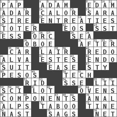 ACROSS 1. Infant food 4. First of billions? 8. Dutch treat 12. The sixth month of the Jewish calendar 14. Bodily heat indicating an inflammation 16. "Two Mules for Sister ____" 17. Male parent of an animal 18. Pleas 20. Carrier 22. Greek goddess of the dawn 23. Fast jet (abbr.) 24. Curvy letter 25. The grampus (Milton) 28. Ocean 30. Mitch Miller's instrument 31. Following 35. Automobile 37. Den 40. Make new 41. Inventor's middle name 42. _____ Park, CO 44. Inside; within (prefix) 45. Set or collection 46. Relaxation 47. Filthy place 48. Mexican monetary units 50. Technical 52. To free from 54. Compass dir. 55. Cards in a Roman deck? 58. _-fi 61. Car dealer's back yard 63. Baking chambers 65. Pieces 70. Of or related to the anus 71. High mountains 72. Off limits 73. Prong on a fork 74. Political cartoonist Thomas 75. Sinks 76. Fish or hair follower DOWN 1. Thick mixture 2. Goodbye (Sp.) 3. Components 4. Adept person 5. Daniel's nick name 6. The first octave above the treble staff 7. Greater amount 8. Eastern Standard Time (abbr.) 9. Raised platform 10. Ancient Greek god of war 11. Vertical spar for supporting sails 13. To separate or throw off 15. Vintage cars 19. Toward the sea 21. Director Reiner 26. Hero or heavy, e.g. 27. Desist 29. Anew 30. Speaker 32. Portable shelter 33. Whirlpool 34. Friend of Pooh 35. A slight indication 36. Advice 38. Call ___ day 39. Musical pauses 41. Cleo's killer 43. Perceives with the eye 49. Grain storage tower 51. Corporate head (abbr.) 53. Do not 55. Soviet premier 1918-24 56. Empty; void 57. Small island 58. Examine hastily 59. Root beer relative 60. Naughty children 62. Beverages made from leaves 64. Large container 66. Pacific Standard Time (abbr.) 67. Basketball assoc. 68. Coat; cloak 69. Mayday