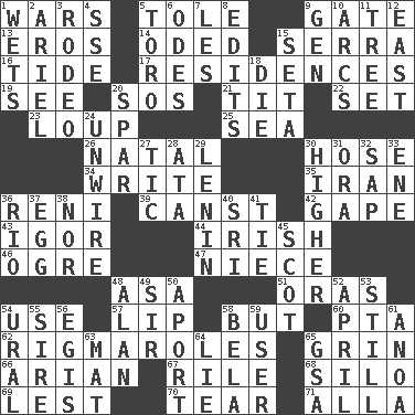 ACROSS 1. Armed conflicts 5. Lacquered or enameled metalware 9. Yard entry 13. Greek god of love 14. Wrote a lyric poem 15. Father Junipero _ 16. Periodic rise and fall of the sea level 17. Homes 19. Perceive with the eye 20. Distress signal 21. Teat (slang) 22. Put into a specified state 23. Central Nebraska county 25. Ocean 26. Brizilian seaport 30. Stockings 34. Compose 35. SW Asia republic 36. Painter Guido (1575-1642) 39. 2nd pers. sing. pres. of can (arch.) 42. Stare wonderingly 43. Russian composer Stravinsky 44. From or relating to Ireland 46. Legendary monster 47. Sibling's daughter 48. White ___ sheet 51. Mouths or openings 54. Purpose 57. Mouth edge 58. Yet 60. Parent Teacher Assoc. 62. Frustrating wastes of time 65. Amused look 66. Believer in; advocate of (suffix) 67. Cause heat under the collar 68. Grain storage tower 69. For fear that 70. Pull apart 71. Silent film actress Nazimova DOWN 1. Soaks 2. Satellite of Uranus 3. Cowboy competition 4. Compass dir. 5. "Corrida" creature 6. Lyric poems 7. French article 8. Proofreads 9. Commissioned military rank (abbr.) 10. Arches 11. Woody plant 12. Compass direction 15. Stalk of a moss capsule 18. Pass on 20. Practice fight 24. Undo the wiring of 27. Nervous spasm 28. "One Day ___ Time" 29. Soviet premier 1918-24 30. Having greater elevation 31. Mouth or opening 32. Plant excrement 33. Compass dir. 36. _ de Janeiro 37. Oval reproductive body of a fowl 38. And not 40. Indian title of respect (Mr.) 41. Standoff 45. Native of Scotland 48. Actor Alda or Thicke 49. Title for a knight 50. To the left, to Queeg 52. Showery time 53. Free from disturbance or agitation 54. Mountain range 55. Father 56. The front part of a cuirass 58. Actor Lugosi 59. One who makes use of a thing 61. Small Philippine buffalo 63. Floor covering 64. Whopper 65. Girls' org. (abbr.)