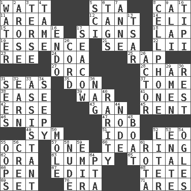 ACROSS 1. Electrical Unit 5. R.R. building 8. Domesticated feline 11. Length times width 12. Patter 14. Biblical high priest 15. Singer Mel 17. Omens 18. Pet locale 19. Substance 21. Ocean 22. Cards in a Roman deck? 23. To separate or throw off 24. ___ good deed 25. Reproach for some lapse or misdeed 27. The grampus (Milton) 28. Burn to charcoal 31. Oceans 35. Spanish title 37. Heavy book 38. Relaxation 39. Armed conflict 41. Singles 42. Celtic language 43. Separate the seeds from cotton 45. Monthly bill 46. Sever or remove by pinching or nipping 47. Director Reiner 49. Symbol (abbr.) 51. Wedding promise 52. Lion 55. Sep. follower 57. Single 60. Separating forcefully 62. Mouth or opening 63. Containing lumps 65. Add up to 66. Writing instrument 67. Prepare for publication 68. Wig 69. Put into a specified state 70. Epoch 71. Ancient Greek god of war DOWN 1. Wetness 2. Came up 3. Laconic 4. Docile 5. _-fi 6. Labels 7. Queen of England 1702-14 8. Portable communications device 9. Jai _ 10. Native american tent (variation) 13. Russian ruler of old 16. Inside; within (prefix) 17. Manatee 20. Drawstring 26. Thespian 29. So be it 30. Repose 31. Observes 32. Merit 33. Aide 34. Not well drained, as in land 36. Tired old horse 40. Noteworthy scarcity 44. Thickened enlargement 48. Water vessel 50. Undercover agent 52. 61 cubic inches 53. Maternal 54. Stares at amorously 55. I made a mistake 56. Algonquian 58. Naked 59. Arab leader 61. Roll call or roster of names 64. Parent Teacher Association (abbr.)