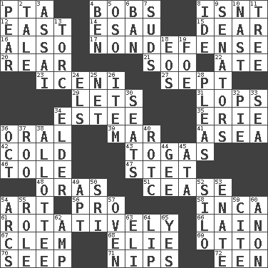 ACROSS 1. Parent Teacher Association (abbr.) 4. Moves up and down 8. Is not 12. 90 degrees 14. Son of Isaac 15. Letter starter 16. In addition 17. Unrelated to defense, as in spending 20. Stern 21. "Barney Miller" actor Jack 22. Had dinner 23. Ancient Celtic tribe of eastern Britain 27. Back-to-school mo. 29. Allows 31. Chops off 34. First name in cosmetics 35. 4th largest of the Great Lakes 36. Relating to the mouth 39. Spoil 41. At sea 42. Chilled 43. Ancient Roman robes 46. Lacquered or enameled metalware 47. Proofreading order 48. Mouths or openings 51. Desist 54. Tate display 56. Adept person 58. South American Indian 61. Rotating or pertaining to rotation 66. (Had) reclined 67. Clement's nick name 68. Writer Wiesel 69. "Beetle Bailey" pooch 70. Ooze 71. Pinches, bites 72. Car or cant ending DOWN 1. Lightbulb-shaped fruit 2. Falsehood 3. Slender Brazilian palm 4. Benjamin's nick name 5. Bear (Spanish) 6. Prohibit 7. Beer foam 8. Binary compound 9. Legislators 10. Political cartoonist Thomas 11. Relationship diagram 13. Torque (variant) 18. Greek goddess of the dawn 19. Enemy 24. Raised railways 25. Remaining after all deductions 26. A whole individual unit 28. Entreaties 30. Theater features 32. Sliced dessert 33. Ocean 34. A person who is older than you are 36. Sep. follower 37. Friend of Pooh 38. One to whom something is allotted 40. College mil. group 44. Turn to the right 45. "One Day ___ Time" 49. Fitting 50. Indian title of respect (Mr.) 52. Grain storage tower 53. Related on the mother's side 54. Arches 55. Hero or heavy, e.g. 57. Baking chamber 59. Quote 60. At once, immediately (arch.) 62. Electrical Unit 63. Biblical high priest 64. Mouth edge 65. Consenting reply