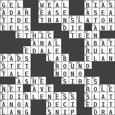 ACROSS 1. Set 4. Welt 8. Prejudice 12. The sixth month of the Jewish calendar 14. Comfort 15. At sea 16. Event that recurs at intervals 17. Interpreter 20. Snakelike fish 21. Pass on 22. Black tropical American cuckoo 23. Value system 27. Adolescent 29. Of or related to the anus 31. Blind as ____ 34. Peak District village in England 35. Court order 36. Groovy apts. 39. Experiment locale 41. Enthusiasm 42. Proofreading order 43. Unit of ammunition 46. Story 47. Words to Nanette 48. American tennis player Robert 51. Begets 54. Remaining after all deductions 56. "___ Maria" 58. Hero or heavy, e.g. 61. The property of being fit to eat 66. Narrow board 67. Small Philippine buffalo 68. Tenth: prefix 69. Prepare for publication 70. Austrian-born American filmmaker Fritz 71. Clip 72. Mouth or opening DOWN 1. Yard entry 2. Singer Brickell 3. Dipping utensil 4. Dripping 5. Ewer handle 6. White ___ sheet 7. Grant temporary use of 8. Sound made by sheep 9. Byzantium, centuries later 10. Period of immesurable duration 11. Indian skirt 13. Relief 18. Be seated 19. Area sheltered from the wind 24. Possessed 25. _ tizzy (2 wds.) 26. Give a ring to 28. Having ears or earlike features 30. Memorize 32. According to 33. "___ Little Indians" 34. _____ Park, CO 36. Pacific Standard Time (abbr.) 37. "One Day ___ Time" 38. Accusation by an informer 40. Scornful sounds 44. University (slang) 45. Not either 49. Actor Linden 50. First lady 52. Celtic language 53. Twentieth part of a lira 54. Be tempered by heat 55. Pulitzer Prize-winning author Ferber 57. Conclusions 59. Den 60. Singer James 62. Container for groceries 63. Car or cant ending 64. _-fi 65. Small drink