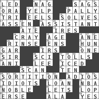 ACROSS 1. Directed 4. Tired old horse 7. Settles 11. Mouth or opening 12. Sharp bark 13. Friendly 14. Three (prefix) 15. Snakelike fish 16. Finds the solution 17. NE Netherlands city 19. Aide 21. Had dinner 23. Angers 24. Supercomputer manufacturer 25. Mature 26. One (Scot) 29. Wash lightly 30. Followers of ems 31. Attila the _ 32. Slender fish 33. Big collection agency 34. Single 35. Title for a knight 36. _-fi 37. For Whom the Bell _____ 40. Black tropical American cuckoo 41. Area sheltered from the wind 42. On the rocks 43. Glance over 45. Nine, plus one 46. Determination 51. Goodbye (Sp.) 55. Foolish or stupid persons 56. Grant temporary use of 58. Basketball assoc. 59. Having high moral qualities 60. Allows 61. Chop off 62. Celtic language 63. In the manner of 64. Affirmative reply DOWN 1. Globular water bottle used in Asia 2. Blunders 3. Raised platform 4. Born 5. Silent film actress Nazimova 6. Global Positioning Systems (abbr.) 7. Table seasonings 8. Inventor's middle name 9. Small, secluded valley 10. System (abbr.) 12. Gossips 13. Introduce or present, as a question 16. Fathers 18. Merit 20. Attaches a signature 22. Sight organ 24. High-altitude cloud 25. Nest on high 26. Hold, grip (Informal) 27. Religious women 28. Compass dir. 29. Precipitation 32. Girls' org. (abbr.) 33. Ancient Celtic tribe of eastern Britain 36. Narrow boards 37. Teat (slang) 38. Seas 39. Grant temporary use of 43. Fur scarf 44. Quote 46. Trig term 47. Aroma 48. Chest bones 49. Water jar 50. Christmas carol 52. Inwardly 53. Mitch Miller's instrument 54. Plant excrements 57. _ moment's notice (2 wds.)