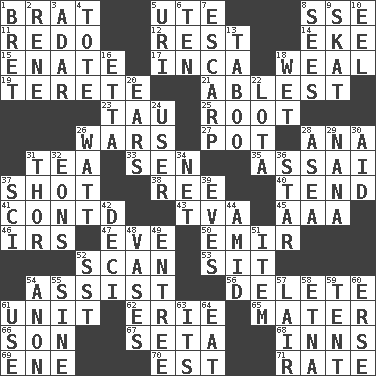 ACROSS 1. Naughty child 5. Shoshoni 8. Compass dir. 11. Redecorate 12. Repose 14. Make supply last 15. Maternal 17. South American Indian 18. Welt 19. Cigar-shaped 21. Most capable 23. The 19th letter of the Greek alphabet 25. Carrot, for example 26. Armed conflicts 27. Plant holder 28. Santa ___, CA 31. Beverage made from leaves 33. Elected rep. 35. Slender Brazilian palm 37. Went for two points 38. To riddle 40. Be inclined (to) 41. Continued (abbr.) 43. Federal power corp. 45. American Automobile Association (abbr.) 46. Big collection agency 47. Night before a holiday 50. Independent ruler or chieftain 52. Examine hastily 53. Be seated 54. Aid 56. Erase 61. A single undivided whole 62. 4th largest of the Great Lakes 65. Mother 66. Manchild 67. Bristle 68. Restaurants 69. Compass dir. 70. Eastern Standard Time (abbr.) 71. Assign a rank or rating to DOWN 1. Cy Young winner Saberhagen 2. French philosopher Descartes 3. The sixth month of the Jewish calendar 4. Haul 5. RI univ. 6. "___ Little Indians" 7. Fortification 8. Observes 9. Three-handed card game 10. Snakelike fish 13. Off limits 16. Singer James 18. Dripping 20. Hearing organs 22. Globular water bottle used in Asia 24. One who makes use of a thing 26. Electrical Unit 28. At sea 29. Grandmother 30. Assist 31. Son of Odin 32. Immeasurably long periods of time 34. Fish or hair follower 36. Play the lead 37. _-fi 39. Nights before holidays 42. Tenth: prefix 44. Among 48. Flower holders 49. Main course 51. A distinct part 52. Fast jet (abbr.) 54. At once, immediately (arch.) 55. Trig term 57. Den 58. Inactive volcano in Sicily 59. Portable shelter 60. Celtic language 61. Purpose 63. ___ a Wonderful Life 64. Ingest