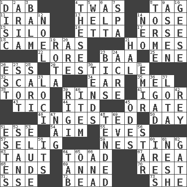 ACROSS 1. Pat or tap gently 4. It was, poetically 8. Label 11. SW Asia republic 13. Aid 14. Sense of smell 15. Grain storage tower 16. Singer James 17. Celtic language 18. Devices for capturing images 21. Dwellings 22. Old wives' tales, e.g. 23. Sound made by sheep 25. Compass dir. 26. Double-curved letter 29. A testis 32. Any of the three canals of the cochlea 34. Ewer handle 35. Cartoonist voice _ Blanc 38. "Corrida" creature 39. Remove soap 41. Russian composer Stravinsky 43. Nervous spasm 44. It would 45. Speak pompously 46. Consumed 50. 24 hours 51. Compass dir. 54. Direct toward a target or goal 55. Nights before holidays 57. Former Milwaukee Brewers owner Bud 59. Nestling 63. Pulled tight 64. Frog relative 67. Type of rug 68. Extremities 69. Queen of England 1702-14 70. State of inaction 71. Compass dir. 72. Necklace unit 73. A female animal or person DOWN 1. Compact _ 2. Operatic vocal solo 3. Lip ointment 4. College papers 5. Dripping 6. Keyboard modifier key 7. Health resort 8. Singer Mel 9. NE Netherlands city 10. Honkers 12. Christmas carol 14. Modern: prefix 19. Round or rotation of duties 20. "We ___ not amused" (Victoria) 21. Actor Linden 23. Prejudice 24. 43,560 square feet 26. Eastern Standard Time (abbr.) 27. Native of Scotland 28. Indian skirt 30. Is inclined (to) 31. Arab leader 33. Locales 36. Mild oath 37. Globular water bottle used in Asia 39. Swiss mountan, "Queen of the Mountains" 40. Detail 42. Marina Del _, California 45. Lyric poems 47. Tired old horse 48. Watched over 49. Night before a holiday 51. _____ Park, CO 52. Actors Connery and Penn 53. Evade 56. Play the lead 58. ___ a Wonderful Life 60. Angers 61. Tender 62. Yard entry 64. Bar bill 65. Single 66. Santa ___, CA