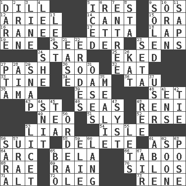 ACROSS 1. Deli pickle 5. Angers 9. Distress signal 12. Satellite of Uranus 14. Patter 15. Mouth or opening 16. The wife of a rajah (variant) 17. Singer James 18. Infant locale 19. Compass dir. 20. Sowing specialist 23. Elected reps. 24. Play the lead 25. Supplemented with great effort 27. Romantic infatuation 30. "Barney Miller" actor Jack 32. Consume 33. Prong on a fork 34. Dutch treat 36. The 19th letter of the Greek alphabet 38. Housemaid (var.) 39. Compass dir. 40. Put into a specified state 43. Pacific Standard Time (abbr.) 46. Oceans 48. Painter Guido (1575-1642) 49. Modern: prefix 51. Roguish 52. Celtic language 53. One who doesn't tell the truth 54. Small island 56. Costume for a special activity 58. Keyboard key 61. Cleo's killer 64. Curve 65. Actor Lugosi 66. Off limits 68. Actress Charlotte 69. Water falling in drops from the sky 70. Grain storage towers 71. Keyboard modifier key 72. Cassini of fashion 73. French philosopher Descartes DOWN 1. Have the gumption 2. SW Asia republic 3. Actor's bit 4. Area sheltered from the wind 5. On the rocks 6. Pace 7. Main course 8. R.R. building 9. Having a sole or soles 10. NW Algerian seaport 11. Plant excrements 13. For fear that 21. Relaxation 22. Eats (away) 23. Stalk of a moss capsule 24. A female animal or person 26. Krazy ___ of comics 27. Parent Teacher Assoc. 28. Direct toward a target or goal 29. Fastener 31. Fertile tracts in a desert 35. Ear of corn 37. One who uses or employs something 41. Followers of ems 42. Make a knot 44. In a ____ (agitated or irritated) 45. Beverage made from leaves 47. System (abbr.) 48. Portuguese money of account (variant) 50. Severe or trying experience 53. It is permitted: Lat. 55. Allows 56. "Two Mules for Sister ____" 57. Mountain range 59. Writer Wiesel 60. Austrian-born American filmmaker Fritz 61. Competent 62. Within a short period 63. Airs 65. Sis' sibling 67. Wind
