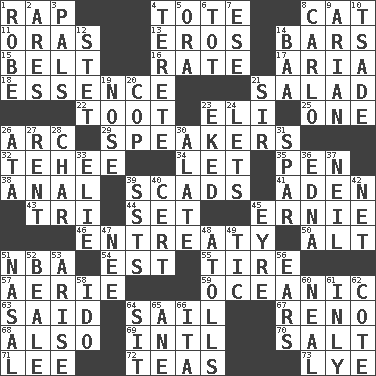 ACROSS 1. Strike 4. Carry 8. Domesticated feline 11. Mouths or openings 13. Greek god of love 14. Oblong pieces of solid material 15. Waist strap 16. Assign a rank or rating to 17. Roberta Peters solo 18. Center 21. Vegetable dish 22. A blast of a horn 23. Connecticut Ivy Leaguer 25. Single 26. Curve 29. Orators 32. Giggle 34. Allow 35. Animal enclosure 38. Of or related to the anus 39. Loads 41. Arabian gulf 43. Three (prefix) 44. Arrange properly for use 45. Bert's buddy 46. Plea 50. Keyboard modifier key 51. Basketball assoc. 54. Eastern Standard Time (abbr.) 55. Hoop that covers a wheel 57. Nest on high 59. Pertaining to the sea 63. Stated 64. Travel by water 67. Former U.S. Attorney General Janet 68. In addition 69. International (abbr.) 70. Table seasoning 71. Area sheltered from the wind 72. Afternoon social gatherings 73. Potassium hydroxide DOWN 1. Loose flowing garment 2. Ancient Greek god of war 3. Friends 4. Cigar-shaped 5. Mouth or opening 6. Small child 7. Compass dir. 8. Monte _, Las Vegas Hotel/Casino 9. Believer in; advocate of (suffix) 10. Sadhe (variant) 12. Proofreading order 14. Sound made by sheep 19. Characteristic smell of wine 20. Police officer (slang) 21. Title for a knight 23. Made supply last 24. Allows 26. "One Day ___ Time" 27. Monthly bill 28. Burn to charcoal 30. Having winglike extensions 31. Practice fight 33. Writer Wiesel 36. Pulitzer Prize-winning author Ferber 37. Famous astronaut Armstrong 39. Fast planes 40. Sure thing 42. Fish or hair follower 45. Jane of fiction 47. Born 48. Ringlike coral islands and reefs 49. Nervous spasm 51. Rhinal 52. Calif. Air Force Base 53. Originate 56. Hearing organs 58. Wedding promise 60. Actress Patricia 61. Inwardly 62. ____ d'Azur (French Riviera) 64. Be seated 65. A saturated hydrocarbon 66. Call ___ day