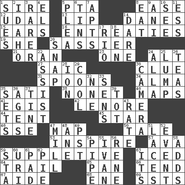 ACROSS 1. Father 5. Parent Teacher Assoc. 8. Relaxation 12. Freehold land 13. Mouth edge 14. Natives or inhabitants of Denmark 15. Hearing organs 16. Pleas 19. A female animal or person 20. More impudent 21. NW Algerian seaport 23. Single 24. Keyboard modifier key 27. Ketch in the Levant 30. A slight indication 31. Soup utensils 34. _ mater 35. Suttee (variant) 38. Music written for nine 40. Atlas contents 41. The front part of a cuirass 42. Poe poem 44. Portable shelter 45. Play the lead 46. Compass dir. 47. Atlas unit 50. Lie 53. Heighten or intensify 57. Actress Gardner 59. Supplying deficiencies 63. On the rocks 64. Hang back 65. Baking dish 66. Be inclined (to) 67. Assistant 68. Compass dir. 69. Fast planes DOWN 1. Takes to court 2. Potato state 3. Less widely known 4. Raised railways 5. Entreaty 6. Airtight sealed metal containers 7. Flats, for short 8. Consume 9. Black tropical American cuckoo 10. Observe 11. Curvy letter 14. Have the gumption 17. River (Sp.) 18. Car or cant ending 20. Fastener 22. Aid 24. Silent film actress Nazimova 25. Mass 26. Beverages made from leaves 28. Electrically charged atom 29. Calm and collected 30. Device for capturing images 32. Compass dir. 33. Elected reps. 35. Puts into a specified state 36. Eons 37. Prong on a fork 39. Small child 43. Pace 47. Place where flour is made 48. A saturated hydrocarbon 49. Pacific Standard Time (abbr.) 51. Shoestrings 52. Incident 54. Corncob 55. _ the terrible 56. French philosopher Descartes 58. Sums up 59. R.R. building 60. RI univ. 61. Groovy apt. 62. Sliced dessert 63. It is