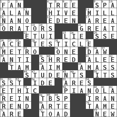 ACROSS 1. Air blower 4. Family _ (genealogy) 8. Health resort 11. Actor Alda or Thicke 13. Hub of activity 14. Place where flour is made 15. Billionth: prefix 16. Paradise 17. Length times width 18. Speakers 21. Relatively large 22. Needle case 23. Falsehood 25. Compass dir. 26. Adept person 29. One of the two male reproductive glands 32. Paris' subway 34. Single 35. Obsolete 38. Opposed to 39. Fragment 41. Toward shelter 43. Scottish cap 44. Direct toward a target or goal 45. Collect or gather 46. SAT takers 50. It is 51. Fast jet (abbr.) 54. Binary compound 55. Ancient Greek god of war 57. Principle of right and wrong 59. Player piano 63. It's straight from the horse's mouth 64. Cook's measure (abbr.) 67. SW Asia republic 68. Tear apart 69. Johnson of "Laugh-In" 70. Docile 71. "We ___ not amused" (Victoria) 72. Frog relative 73. ___ Haven, CT DOWN 1. Papal veil 2. Having or resembling wings 3. Grandmother 4. College paper 5. To free from 6. Night before a holiday 7. Car or cant ending 8. Fathers 9. Entreaties 10. Having winglike extensions 12. Short letter 14. Make imperfect 19. "Beetle Bailey" pooch 20. Regret 21. Set 23. Actor's bit 24. On the rocks 26. Nursemaid (var.) 27. Penny 28. Singer James 30. Singer Mel 31. Dutch treat 33. Basketball hoops 36. Jai ____ 37. Compass direction 39. Saudi Arabian king (1953-1964) 40. Flintstone garb 42. Double-curved letter 45. At sea 47. Nervous spasm 48. Slept 49. Three (prefix) 51. Spanish missionary in California 52. Guide 53. One or ones belonging to thee 56. In a ____ (agitated or irritated) 58. Indiana (abbr.) 60. NW Algerian seaport 61. Unable to walk 62. Afresh 64. Make lace 65. Sis' sibling 66. R.R. building