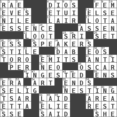 ACROSS 1. Actress Charlotte 4. "Vaya con ____" 8. Opposite of masc. 11. Nights before holidays 13. Needle case 14. Otherwise 15. Mediterranean tributary 16. Den 17. Globular water bottle used in Asia 18. Core 21. NE Netherlands city 22. Plunder 23. _ Lanka 25. Put into a specified state 26. Double-curved letter 29. Orators 32. Vertical member of a panel or frame 34. Pat or tap gently 35. Greek goddess of the dawn 38. "Corrida" creature 39. Sends forth 41. Opposed to 43. For each 44. Modern: prefix 45. Witty Wilde 46. Consumed 50. Followers of ems 51. Period 54. Tate display 55. Conclusions 57. Former Milwaukee Brewers owner Bud 59. Inhabiting a nest 63. Russian ruler of old 64. Put down 67. Length times width 68. Singer James 69. Writer Wiesel 70. Respite 71. Compass dir. 72. Expressed in words 73. A female animal or person DOWN 1. French philosopher Descartes 2. Deliberation 3. Snakelike fish 4. Keyboard key 5. Call ___ day 6. Fr. "Yes" 7. Title for a knight 8. Soft thread for cleaning between teeth 9. First name in cosmetics 10. Intended 12. Sew up the eyelids of hawks and falcons 14. Raised railways 19. Characteristic smell of wine 20. Police officer (slang) 21. Wind 23. Three-handed card game 24. Confederate soldiers (slang) 26. Eastern Standard Time (abbr.) 27. Discontinue 28. Male parent of an animal 30. Goodbye (Sp.) 31. Oceans 33. Australian parrot (variant) 36. At one time in the past 37. Comedian Laurel of Laurel & Hardy 39. Engineer (abbr.) 40. Confront 42. Big collection agency 45. Likelihood 47. Tired old horse 48. Watched over 49. Compass dir. 51. _____ Park, CO 52. Musical pauses 53. Having winglike extensions 56. Play the lead 58. Retirement account (abbr.) 60. Angers 61. Tender 62. Yard entry 64. French article 65. According to 66. One more than two