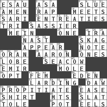 ACROSS 1. Son of Isaac 5. White ___ sheet 8. Change direction abruptly 12. So be it 13. Strike 14. Confronts 15. Indian skirt 16. Pleas 19. Three (prefix) 20. More lively and spirited 21. Count _ (2 wds.) 23. Single 24. Lyricist Gershwin 27. Political cartoonist Thomas 30. Heroin 31. Become visible 34. Observe 35. NW Algerian seaport 38. Composer Copland 40. Washington bills 41. Ear part 42. Manatee 44. Independent ruler or chieftain 45. Undercover agent 46. Elect 47. Opposite of masc. 50. Paradise 53. Preparing or cooking with lard 57. Simpleton 59. Appease 63. Comfort 64. Chest covering 65. Mountains (abbr.) 66. Narrow board 67. Lacquered or enameled metalware 68. Cooking vessel 69. Snakelike fish DOWN 1. Compass direction 2. Excessive but superficial compliments 3. Nest on high 4. Corn or form start 5. Type of rug 6. Without 7. Flats, for short 8. Put into a specified state 9. Luau accessory 10. Shoshoni 11. Double-curved letter 14. Female horse 17. _ de Janeiro 18. Car or cant ending 20. Fastener 22. Sillier 24. Visual representation of an object 25. Pace 26. Matures 28. Health resort 29. Afternoon social gatherings 30. Overwhelmed 32. "We ___ not amused" (Victoria) 33. Wander aimlessly 35. Margarine 36. Play 37. "This won't hurt ____!" 39. Non-commissioned officer (abbr.) 43. Cassini of fashion 47. Sudden quick movement 48. Erode 49. Medical imaging device (abbr.) 51. Peak District village in England 52. Rhinal 54. Moist 55. "Tell ____ the Marines!" 56. A home for chicks 58. Moistens 59. Pacific Standard Time (abbr.) 60. 17th letter of the Greek alphabet 61. Petroleum 62. Before (prefix) 63. Compass dir.