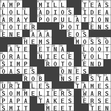 ACROSS 1. Electrical Unit 4. Place where flour is made 8. Afternoon social gatherings 12. Hang loosely or laxly 14. Goodbye (Sp.) 16. The main thing one is thinking about 17. Like ___ of sunshine 18. Census information 20. Carrier 22. Plant holder 23. Followers of ems 24. Compass dir. 25. Auto club (abbr.) 28. Greek goddess of the dawn 30. Equivocates 31. With motion or animation 35. Had dinner 37. Inactive volcano in Sicily 40. Plunder 41. Taken by mouth 42. Sibling's daughter 44. Electrical Unit 45. Simple or foolish person 46. Printing process, for short 47. Conclude 48. Fertile tracts in a desert 50. Singles 52. Director Reiner 54. Science/research agcy. 55. R.R. building 58. RI univ. 61. French article 63. Makes less strong or intense 65. Wine waiters 70. Armed conflicts 71. Dad 72. Receives possession of 73. Celtic language 74. Stricken, poetically 75. Confront 76. Nine, plus one DOWN 1. Having winglike extensions 2. Person of subnormal intelligence 3. Food holder 4. Atlas unit 5. Wedding promise 6. Mouth edge 7. Central Nebraska county 8. Teat (slang) 9. Singer Brickell 10. Period of immesurable duration 11. Without 13. Sodium hydroxide 15. A type of plum 19. Smallest unit of an element 21. Actress Charlotte 26. So be it 27. Being in motion 29. Finds the solution 30. Aide 32. Within a short period 33. Exchanged or delivered for money 34. Baseball player Mel 35. Roberta Peters solo 36. Scottish caps 38. Modern: prefix 39. Gambison 41. Bear (Spanish) 43. Immeasurably long periods of time 49. Not divided or shared with others 51. Newt 53. Waist strap 55. Don Adams' spy role 56. Laconic 57. NE Netherlands city 58. United States Postal Service (abbr.) 59. Wander aimlessly 60. Body of Kaffir warriors 62. Thailand, formerly 64. Deep reverence 66. Floor protector 67. Supplement with great effort 68. Portuguese money of account (variant) 69. Fast jet (abbr.)