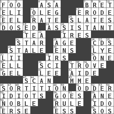 ACROSS 1. Egg _ yung 4. White ___ sheet 7. Cy Young winner Saberhagen 11. Connecticut Ivy Leaguer 12. Cassini of fashion 13. Eat (away) 14. Snakelike fish 15. Pace 16. Chalkboards 17. Administered medicine 19. Helper 21. Beverage made from leaves 23. Angers 24. Play the lead 25. Personal question 26. Music discs 29. Having lost freshness 30. Followers of ems 31. Sodium hydroxide 32. Cards in a Roman deck? 33. Big collection agency 34. Single 35. Pipe bend 36. _-fi 37. Collection of objects 40. Set 41. Area sheltered from the wind 42. Assistant 43. Skim 45. Madame (abbr.) 46. Drawing lots 51. More peculiar 55. Foolish or stupid persons 56. Leaves 58. A saturated hydrocarbon 59. Having high moral qualities 60. Governing power 61. Wedding promise 62. Celtic language 63. Curvy letter 64. Distress signal DOWN 1. Nourish 2. Butter sub 3. Lubricates 4. Chicken ___ king 5. Bristle 6. Grows older 7. Naughty children 8. Roll call or roster of names 9. Genesis locale 10. Trial 12. Severe or trying experience 13. Otherwise 16. Begets 18. Singer James 20. Omens 22. "We ___ not amused" (Victoria) 24. Free from disturbance or agitation 25. Nest on high 26. Garlic unit 27. Centimeter-gram-second unit of force 28. Perceive with the eye 29. Filth; sediment 32. Part of a journey 33. Ancient Celtic tribe of eastern Britain 36. Narrow boards 37. Scottish cap 38. Full of chinks, cracks, or crevices 39. Wrote a lyric poem 43. Fur scarf 44. Quote 46. Trig term 47. Aroma 48. Teases 49. Legendary monster 50. Horse sense 52. Raised platform 53. Inside; within (prefix) 54. Vintage cars 57. Raised railways