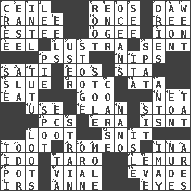 ACROSS 1. To provide with a ceiling 5. Vintage cars 9. Fool 12. The wife of a rajah (variant) 14. At one time in the past 15. To sift 16. First name in cosmetics 17. Double curve, resembling the letter S 18. Electrically charged atom 19. Snakelike fish 20. A period of five years 23. Posted 24. Inconspicuous attention getter 25. Pinches, bites 27. Suttee (variant) 30. Greek goddess of the dawn 32. R.R. building 33. Turn sharply 34. College mil. group 36. _ moment's notice (2 wds.) 38. Erode 39. Thick or sticky substance 40. Fish or hair follower 43. Purpose 46. Enthusiasm 48. Portico 49. Personal Computers (abbr.) 51. Epoch 52. Is not 53. Spoils 54. In a ____ (agitated or irritated) 56. A blast of a horn 58. Lover boys 61. _ tizzy (2 wds.) 64. Wedding promise 65. Edible starchy tuberous root 66. Arboreal primate 68. Cooking vessel 69. Small bottle 70. Dodge 71. Big collection agency 72. Queen of England 1702-14 73. Sight organs DOWN 1. Algonquian 2. Comfort 3. International (abbr.) 4. Area sheltered from the wind 5. Carrot, for example 6. Engineer (abbr.) 7. Seas 8. Observe 9. Frees from moisture 10. Period of immesurable duration 11. Left 13. Snakelike fish 21. One who uses or employs something 22. Moe Howard, for one 23. Argument over a trivial matter 24. Sliced dessert 26. Call ___ day 27. Compass dir. 28. Wing 29. Ballerina skirt 31. Fur scarf 35. Unrefined 37. Pismires 41. A really long time 42. Make lace 44. Specific locale 45. Environmental prefix 47. Billionth: prefix 48. Be seated 50. Put through a sieve 53. Plunders 55. Capri or Wight 56. Native american tent (variation) 57. Aroma 59. Northwest Algerian city 60. Undercover agent 61. "If ____ say so..." 62. Naked 63. Ancient Greek god of war 65. Federal power corp. 67. First lady