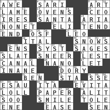 ACROSS 1. Deep reverence 4. Indian skirt 8. Nonscientific branch of learning 11. Unable to walk 13. Baking chambers 15. Corporate head (abbr.) 16. Angers 17. Before Barbara or Clara 18. Roberta Peters solo 19. Music written for nine 21. Biblical high priest 22. Watch over 23. Conclude 24. Order of Saint Francis (abbr.) 27. Lion 29. Slanted text style (abbr.) 30. Frozen precipitation (plural) 34. Followers of ems 36. System (abbr.) 39. Gurus 40. Narrow board 41. Scornful expression 43. For fear that 44. Lessep's creation 46. Billionth: prefix 47. Allow 48. Lacking in sense or substance 49. Dinghy 51. Benjamin's nick name 53. R.R. building 54. Compass dir. 57. He sold his birthright 60. Call ___ day 63. Webber/Rice musical 65. Hang loosely or laxly 66. Some stationery 69. Came down and settled, as after flight 70. "Barney Miller" actor Jack 71. Grin 72. Lacquered or enameled metalware 73. Compass dir. 74. Comfort 75. Elected rep. DOWN 1. Place in a line 2. Make _____ (do battle with) 3. Make improvements or corrections to 4. Distress signal 5. Actress Gardner 6. French philosopher Descartes 7. International (abbr.) 8. Land measure 9. It's straight from the horse's mouth 10. Frog relative 12. Compass dir. 14. Move on water 18. Lacking a tonal center or key 20. Small child 25. Backtalk 26. Film actor Errol 28. Curvy letter 29. Byzantium, centuries later 31. Double curve, resembling the letter S 32. Compass direction 33. Fast jet (abbr.) 34. Flair 35. Grandmother 37. Ocean 38. Looks after 40. _-fi 42. Carrot, for example 45. Area sheltered from the wind 50. Actress Charlotte 52. Pinches, bites 54. Grain storage towers 55. Vertical member of a panel or frame 56. Consumed 57. Otherwise 58. Within a short period 59. _ vera 61. Docile 62. Capital of Western Samoa 64. Large container 67. Raised railways 68. To sift