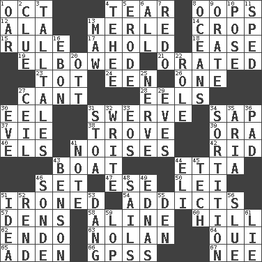 ACROSS 1. Sep. follower 4. Separate forcefully 8. I made a mistake 12. Chicken ___ king 13. Haggard of country music 14. Riding implement 15. Governing power 17. Hold, grip (Informal) 18. Relaxation 19. Shoved, as through a crowd 21. Spoke pompously 23. Small child 24. Car or cant ending 26. Single 27. Patter 28. Snakelike fish 30. Snakelike fish 31. Turn aside suddenly 34. Plant excrement 37. Compete 38. Collection of objects 39. Mouth or opening 40. Raised railways 41. Annoying sounds 42. To free from 43. Water vessel 44. Singer James 46. Arrange properly for use 47. Compass dir. 50. Luau accessory 51. Pressed 54. Inveterate users 57. Habitations of wild animals 58. Place in a line 60. Land elevation 62. Inside; within (prefix) 63. Pitcher Ryan 64. Fr. "Yes" 65. An important port of Yemen 66. Global Positioning Systems (abbr.) 67. Born DOWN 1. Rowing implement 2. A slight indication 3. Baron Munchausen's specialties 4. Giggle 5. Wear away 6. 100% 7. Redecorate 8. Seas 9. Speak pompously 10. Introduce or present, as a question 11. Moved rapidly 13. Opening into something insatiable 16. Inky black, to poets 20. Baseball player Mel 22. Hero or heavy, e.g. 25. Boldness 27. To provide with a ceiling 29. Nights before holidays 30. First lady 31. Portico 32. Compose 33. Greek goddess of the dawn 34. Making a chance decision by using lots 35. Roberta Peters solo 36. Groovy apt. 41. Short letter 43. Gillaume's butler role 44. Biblical high priest 45. Georgia ____ (Atlanta school) 46. Message 48. Travels by water 49. Ferber et al. 51. The main thing one is thinking about 52. Tear apart 53. Mild oath, euphamism for damn 55. Lair 56. Change direction abruptly 59. Trim (branches) 61. Whopper