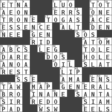 ACROSS 1. Inactive volcano in Sicily 5. Nilotic language 8. Small child 11. A really long time 12. Blunders 14. Single 15. Marketplace scale 17. Ancient Roman robes 18. Adept person 19. Center 21. Keyboard modifier key 22. Lair 23. Born 24. Commissioned mil. rank 25. Mayday 27. To free from 28. Smallest unit of an element 31. Lettered men learn these first 35. Part of a journey 37. Lacquered or enameled metalware 38. Have the gumption 39. Two (Sp.) 41. Hollow 42. Small Philippine buffalo 43. Lubricate 45. Narrow board 46. Repose 47. Mouth edge 49. Compass dir. 51. Housemaid (var.) 52. Followers of ems 55. The 23rd letter of the Hebrew alphabet 57. Atlas unit 60. Commissioned military rank 62. Sis' sibling 63. Lacking in sense or substance 65. Before Barbara or Clara 66. Title for a knight 67. Redecorate 68. Thailand, formerly 69. Writing tablet 70. Compass dir. 71. Snakelike fish DOWN 1. Eroded 2. Laconic 3. Trap for birds or small mammals 4. Singer Murray 5. Lion 6. Capital and largest city of Mongolia 7. Relating to the mouth 8. Inedible or poisonous agaric 9. Single time 10. Adolescent 13. Fast planes 16. Engineer (abbr.) 17. Watched over 20. To provide with a ceiling 26. Expletives 29. Rounded earthenware pot or jar 30. Confront 31. The sixth month of the Jewish calendar 32. Object of repulsion 33. What you're doing now 34. Theater features 36. Thick or sticky substance 40. Fodder prepared in a silo 44. Citrus frut 48. Baking dishes 50. Independent ruler or chieftain 52. Bert's buddy 53. Brizilian seaport 54. Hits or strikes with great force 55. Cook's measure (abbr.) 56. Roberta Peters solo 58. Afresh 59. Writing tablets 61. Comfort 64. At this time