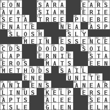 ACROSS 1. A really long time 4. "Two Mules for Sister ____" 8. Hearing organs 12. Actress Gardner 13. Thailand, formerly 14. One of the Great Lakes 15. Stalk of a moss capsule 17. Family _ (genealogy) 18. Military trainee 19. Related on the mother's side 21. Teachers' org. 23. Cleo's killer 24. Agitate, as a liquid 26. Stealthy 28. Chow _ 30. Substance 34. Music discs 37. Texas town _ City 39. Earth 40. Pet locale 41. Bert's buddy 43. R.R. building 44. Greek god of love 46. Floor coverings 47. Car or cant ending 48. Modes 51. Travel by water 54. Compass dir. 55. Join together 58. Cuckoo 61. Followers of ems 63. Approach 65. "_ and Lucy" (Charlie Brown theme song) 67. Seaweed 71. Celtic language 72. Flats, for short 73. Toward shelter 74. Ocean 75. Small island 76. Small, secluded valley 77. Shade tree DOWN 1. Relaxation 2. Baking chambers 3. Relating to or accompanying birth 4. Fast jet (abbr.) 5. Wind 6. Actress Charlotte 7. So be it 8. Snakelike fish 9. Length times width 10. Chest bones 11. Ooze 16. Smallest unit of an element 18. Friends 20. Compass dir. 22. Double-curved letter 25. Flintstone garb 27. It is so 29. Typical models 30. Proofreads 31. Sense of smell 32. Quote 33. Liveliness 34. Clement's nick name 35. Have the gumption 36. Blemish 38. Heredity factor (abbr.) 42. He sold his birthright 45. A female animal or person 49. Washington bills 50. Lair 52. _ tizzy (2 wds.) 53. Actor's bit 56. Laconic 57. Artist's stand 58. Jai ____ 59. Cuts off 60. International (abbr.) 62. Heroin 64. 480, 500 or 516 sheets of paper 66. Purpose 68. Pipe bend 69. Area sheltered from the wind 70. Fenced enclosure