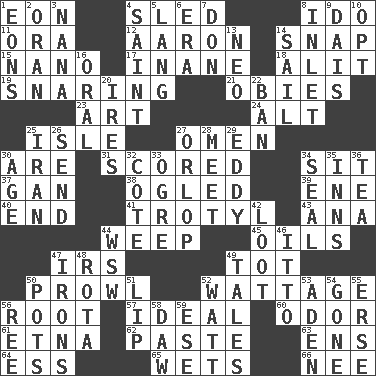 ACROSS 1. A really long time 4. Downhill vehicle 8. Wedding promise 11. Mouth or opening 12. Composer Copland 14. Fastener 15. Billionth: prefix 17. Silly 18. Came down and settled, as after flight 19. Catching in a trap 21. Off-Broadway awards 23. Tate display 24. Keyboard modifier key 25. Capri or Wight 27. Presage 30. "We ___ not amused" (Victoria) 31. Tallied 34. Be seated 37. Separate the seeds from cotton 38. Stared at amorously 39. Compass dir. 40. Conclude 41. Trinitrotoluene 43. Santa ___, CA 44. Shed a tear 45. Petroleums 47. Big collection agency 49. Small child 50. Move like a hungry wolf 52. Electrical Measurement 56. Carrot, for example 57. Perfect 60. Scent 61. Inactive volcano in Sicily 62. Thick mixture 63. Followers of ems 64. Curvy letter 65. Soaks 66. Born DOWN 1. Immeasurably long periods of time 2. NW Algerian seaport 3. Grandmother 4. Inhabitant of Heaven 5. Austrian-born American filmmaker Fritz 6. Epoch 7. Spanish title 8. An arm off of a larger body of water 9. Raised platform 10. Elect 13. Modern: prefix 14. Travel by water 16. Of the mouth 20. Angers 22. Bar 25. SW Asia republic 26. Transmit 27. Fourth or lowest deck 28. Confront 29. Whirlpool 30. Mature 32. ____ d'Azur (French Riviera) 33. Legendary monster 34. Lick closed 35. Taverns 36. Beverage made from leaves 42. Spoils 44. Compass dir. 46. "Tell ____ the Marines!" 47. Metal shackles 48. Roll call or roster of names 49. Stories 50. Cooking vessels 51. Mouth edge 52. Electrical Unit 53. Arabian gulf 54. Went 55. Celtic language 56. To riddle 58. Simpleton 59. Compass dir.