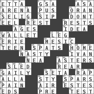 ACROSS 1. Singer James 5. Girls' org. (abbr.) 8. White ___ sheet 11. Sports stadium 13. Product of festering 14. NW Algerian seaport 15. Major League Baseball Commissioner Bud 16. Small drink 17. Do not 18. Snakelike fish 19. Relief 21. Musical pauses 22. Matures 24. The main thing one is thinking about 25. Place for singles 27. Part of a journey 29. One of the Great Lakes 30. Mesonic 32. Adolescent 33. Arguments over trivial matters 35. Dwelling 39. Characterized by obscenity 41. _ the terrible 42. Teachers' org. 43. Michaelmas daisies 45. Downhill vehicle 48. Stern 49. Lightheartedly 50. Bristle 52. Reproach for some lapse or misdeed 55. Silent film actress Nazimova 56. Filthy place 57. Practice fights 59. Ache 60. Wind 61. _____ Park, CO 62. Begley and Asner 63. Before (prefix) 64. Trial DOWN 1. Comfort 2. Family _ (genealogy) 3. Copy Pinocchio 4. Cuckoo 5. Global Positioning Systems (abbr.) 6. Set or collection 7. Viper 8. Came up 9. Before Barbara or Clara 10. Pismires 12. Match 14. Wrote a lyric poem 20. Eastern Standard Time (abbr.) 21. Swiss mountan, "Queen of the Mountains" 23. American astronaut and politician John 25. Dripping 26. "We ___ not amused" (Victoria) 27. Allow 28. Curvy letter 30. Can I? 31. Riviera of "Kiss of the Spider Woman" 33. Compass dir. 34. Parent Teacher Assoc. 36. Make much ado about nothing 37. Make imperfect 38. Followers of ems 40. Actor Griffith 43. Tate display 44. Gospel singer Marvin 45. First course 46. Ms. Damita and namesakes 47. Enthusiasm 49. Open wide 50. Use a spoon 51. Jane of fiction 53. Ancient Greek god of war 54. Inconspicuous attention getter 56. Plant excrement 58. Pacific Standard Time (abbr.)