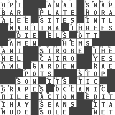 ACROSS 1. Elect 4. Of or related to the anus 8. Fastener 12. Tavern 13. Food holder 14. Israeli folk dance 15. Toward shelter 17. Settings 18. International (abbr.) 19. Chrissie's court nemesis 21. Trios 23. Expire 24. Raised railways 26. Baseball player Mel 27. So be it 28. Folds over and sews together 30. Black tropical American cuckoo 31. Disco prop 34. Definite Article 37. Cartoonist voice _ Blanc 38. Capital of Egypt 39. Affirmative reply 40. Leather borer 41. Place where plants grow 42. Actress Charlotte 43. Plant holders 44. Obstruct or block passage 46. Manchild 47. ___ a Wonderful Life 50. Nervous spasm 51. Wine fruits 54. Pertaining to the sea 57. Cause heat under the collar 58. Gambison 60. Prepare for publication 62. "If ____ say so..." 63. Seines 64. Call ___ day 65. Naked 66. Not divided or shared with others 67. Remaining after all deductions DOWN 1. Chief or king in Benin or Nigeria 2. Inside of hand 3. Excercise machine 4. Place in a line 5. Relating to or accompanying birth 6. Had dinner 7. For fear that 8. Upper-body garments 9. Music written for nine 10. Johnson of "Laugh-In" 11. Friends 13. Air pressure measure (abbr.) 16. One of the Great Lakes 20. "___ Little Indians" 22. Dwelling 25. Dinah or Pauly 27. Afresh 29. Inky black, to poets 30. Housemaid (var.) 31. Get outta here! 32. Tarsus (plural) 33. To free from 34. Polypeptide antibiotic 35. Pile 36. Compass dir. 41. Went 43. Wimpy's pal 44. R.R. building 45. Prong on a fork 46. First course 48. "_____ Recall" 49. Biscuitlike quick bread 51. Broad smile 52. Tall New Zealand timber tree 53. Backtalk 55. Followers of ems 56. Quote 59. Corporate head (abbr.) 61. Make lace