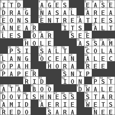 ACROSS 1. It would 4. Eras 8. Comfort 12. To draw with force 14. Relating to the nose 16. Type of rug 17. Immeasurably long periods of time 18. Pleas 20. Approach 22. ___ a Wonderful Life 23. The first octave above the treble staff 24. French article 25. Rowing implement 28. Observe 30. Opening into or through something 31. Indian state 35. 23rd letter of the Greek alphabet 37. Table seasoning 40. Root beer relative 41. Long (Scottish) 42. Sea 44. Actor Baldwin 45. Brightly colored fish 46. Israeli folk dance 47. Portuguese money of account (variant) 48. Some stationery 50. Clip 52. To free from 54. Electrically charged atom 55. Pacific Standard Time (abbr.) 58. "One Day ___ Time" 61. Surprise greeting 63. A sleeping potion; an opiate (poet.) 65. Innocence, gentleness, or tenderness 70. Play the lead 71. Among 72. Nest on high 73. Moistens 74. Do over again 75. "Two Mules for Sister ____" 76. Born DOWN 1. Standard of perfection 2. Marketplace scale 3. Natives or inhabitants of Denmark 4. A saturated hydrocarbon 5. Separate the seeds from cotton 6. Eastern Standard Time (abbr.) 7. Indian skirt 8. Ingest 9. Operatic vocal solo 10. Stitch closed the eyes of (a falcon) 11. 90 degrees 13. Girls' org. (abbr.) 15. Allows 19. Toward the sea 21. Friend of Pooh 26. In addition 27. Arrive at 29. Fortification 30. Having greater elevation 32. Flatfish 33. Toward shelter 34. Big _ 35. Dad 36. Fastener 38. Lion 39. Tarsus (plural) 41. Chop off 43. Billionth: prefix 49. Teases 51. Working for oneself (abbr.) 53. Capital of the state of Qatar 55. Eucharist need 56. Schedule 57. Laconic 58. The sixth month of the Jewish calendar 59. Heavy book 60. Enthusiastic 62. Singles 64. Compass dir. 66. Wedding promise 67. Period 68. Title for a knight 69. Ocean