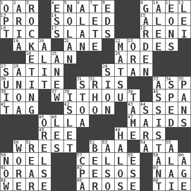 ACROSS 1. Boat paddle 4. Maternal 9. Highlander 13. Adept person 14. Having a sole or soles 15. _ vera 16. Nervous spasm 17. Narrow boards 18. Painter Guido (1575-1642) 19. Alias (abbr.) 21. A saturated hydrocarbon 22. Methods 24. Liveliness 26. "We ___ not amused" (Victoria) 27. Smooth fabric 29. Comedian Laurel of Laurel & Hardy 30. Join together 31. Indian titles of respect 33. Viper 36. Electrically charged atom 37. Sans 40. Health resort 41. Label 42. Within a short period 43. NE Netherlands city 45. Spanish pot 47. Women servants 48. To riddle 49. Possessive pronoun 50. Obtain by seizing forcibly or violently 52. Sound made by sheep 54. _ moment's notice (2 wds.) 56. Christmas carol 57. Cell (Danish) 59. According to 61. Mouths or openings 62. Mexican monetary units 63. Tired old horse 64. We are 65. Came up 66. Standoff DOWN 1. Elect 2. Roberta Peters solo 3. Shooting up abruptly 4. Double-curved letter 5. Pitcher Ryan 6. Actor Alda or Thicke 7. False hair 8. Begley and Asner 9. Place where plants grow 10. Toward shelter 11. Immeasurably long periods of time 12. Luau accessory 20. Came down and settled, as after flight 22. Taiwanese island in East China Sea 23. Mouth or opening 25. Afresh 27. Costume for a special activity 28. Small Philippine buffalo 29. The Jewish people; Israel 31. Portico 32. 17th letter of the Greek alphabet 33. Aide 34. Broke a traffic law 35. Zero-star reviews 38. Small island 39. Docile 44. "Two Mules for Sister ____" 45. Threatening words 46. French article 49. Saint headwear 50. Had on 51. Bring up, as a child 52. Fermented drink made from hops 53. In addition 55. Jai _ 56. Immediately 57. Numbers guy (abbr.) 58. Compass dir. 60. Grow older