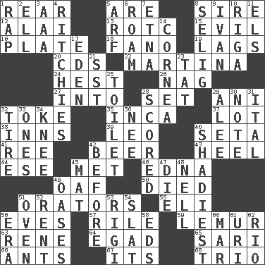 ACROSS 1. Bring up, as a child 5. "We ___ not amused" (Victoria) 8. The founder of a family 12. Jai ____ 13. College mil. group 15. Tending to cause great harm 16. Food holder 18. Papal veil 19. Falls behind 20. Music discs 22. Chrissie's court nemesis 24. Behest 26. Tired old horse 27. To the inside or interior of 28. Put into a specified state 29. Cuckoo 32. Puff or smoke 35. South American Indian 37. Car dealer's back yard 38. Taverns 39. Lion 40. Bristle 41. To riddle 42. Fermented drink made from hops 43. The bottom of a shoe or boot 44. Compass dir. 45. Was introduced to 46. Pulitzer Prize-winning author Ferber 49. Clumsy lout 50. Passed on 51. Speakers 55. Connecticut Ivy Leaguer 56. Nights before holidays 57. Cause heat under the collar 59. Arboreal primate 63. French philosopher Descartes 64. Mild oath 65. Indian skirt 66. Pismires 67. ___ a Wonderful Life 68. Musical group of three DOWN 1. Hit sharply and swiftly 2. Pipe bend 3. Auto club (abbr.) 4. Actors Guy, Robert Welles, and Clint 5. Sandy's bark 6. Wander 7. Inactive volcano in Sicily 8. Major League Baseball Commissioner Bud 9. "Terrible" tsar 10. Port city in Latvia 11. Raised railways 14. Pupil covering 17. Genesis locale 21. Fast jet (abbr.) 23. Make lace 25. Bathroom plumbing fixture 28. Tallied 29. Toward shelter 30. Make mention of 31. Slanted text style (abbr.) 32. Hoop that covers a wheel 33. Singles 34. Leg joint 36. Born 40. Most dark, concealed or hidden 42. Prior to 45. Floor protector 47. Expire 48. 1994 drama film starring Jodie Foster 49. Fertile tracts in a desert 51. Baking chamber 52. Monthly bill 53. Swiss mountan, "Queen of the Mountains" 54. Narrow board 56. Epoch 58. Begley and Asner 60. Make imperfect 61. RI univ. 62. River (Sp.)
