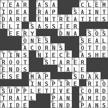ACROSS 1. Lacerate 5. White ___ sheet 8. Clement's nick name 12. The content of cognition 13. Strike 14. Inhabitant of Heaven 15. Have the gumption 16. Pleas 19. Connecticut Ivy Leaguer 20. More lively and spirited 21. Suggestive of the supernatural 23. Heredity factor (abbr.) 24. Distress signal 27. Washington bills 30. Lick closed 31. Oak nuts 34. "Beetle Bailey" pooch 35. Airtight sealed metal containers 38. Sibling's daughter 40. American tennis player Robert 41. Carrot, for example 42. A viewer who gazes fixedly 44. Conclusions 45. Falsehood 46. Compass dir. 47. Atlas unit 50. Neighbor of Neb. 53. Motivate 57. River (Sp.) 59. Supplementary 63. Drawstring 64. Go after with the intent to catch 65. Baking dish 66. Among 67. Assistant 68. Conclude 69. Zero-star reviews DOWN 1. Periodic rise and fall of the sea level 2. Peak District village in England 3. Nest on high 4. Actress Charlotte 5. Length times width 6. Without 7. Flats, for short 8. Feline 9. Cards in a Roman deck? 10. Compass dir. 11. Mountains (abbr.) 14. "Two Mules for Sister ____" 17. To free from 18. Car or cant ending 20. Synchronize (abbr.) 22. Exposes to great heat 24. Puts into a specified state 25. Pledge 26. _ gin 28. Period of immesurable duration 29. Indian titles of respect 30. Flew 32. Fish or hair follower 33. Leave at once 35. Family _ (genealogy) 36. Charged particles 37. Thickened enlargement 39. Epoch 43. Otherwise 47. Place where flour is made 48. One (Scot) 49. Pacific Standard Time (abbr.) 51. Scent 52. Japanese brewing company 54. Corncob 55. "Terrible" tsar 56. Tear apart 58. Probability 59. R.R. building 60. RI univ. 61. Writing tablet 62. Sliced dessert 63. Head covering