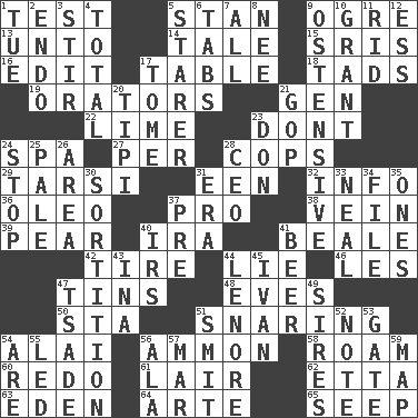 ACROSS 1. Trial 5. Comedian Laurel of Laurel & Hardy 9. Legendary monster 13. To (old English) 14. Falsehood 15. Indian titles of respect 16. Prepare for publication 17. Eating place 18. Small amounts or degrees 19. Speakers 21. Commissioned military rank (abbr.) 22. Citrus frut 23. Do not 24. Health resort 27. For each 28. 911 reaches them 29. Tarsus (plural) 31. Car or cant ending 32. Information 36. Margarine 37. Adept person 38. Distinctive style or manner 39. Lightbulb-shaped fruit 40. Lyricist Gershwin 41. Memphis, Tenn. Street 42. Hoop that covers a wheel 44. Untruth 46. French article 47. Metal containers 48. Nights before holidays 50. R.R. building 51. Catching in a trap 54. Mountain range southwest of Kyrgyzstan 56. ID or VA city 58. Wander aimlessly 60. Redecorate 61. Den 62. Singer James 63. Genesis locale 64. Johnson of "Laugh-In" 65. Ooze DOWN 1. Third day of the wk. 2. Inside; within (prefix) 3. Tumult 4. "_____ Recall" 5. A viewer who gazes fixedly 6. Bar bills 7. Everything 8. Born 9. Clearly or manifestly demonstrative 10. Let have 11. To free from 12. Curvy letter 17. Heavy book 20. Native american tent (variation) 21. Grand Old Party 23. Spanish title 24. Halt 25. Diluted with white 26. Type of rug 28. Corporate head (abbr.) 30. Making a chance decision by using lots 31. Period 33. Be tempered by heat 34. Do some clerical work 35. Washington bills 37. Before (prefix) 40. Big collection agency 41. Fermented drink made from hops 43. _ tizzy (2 wds.) 44. Poe poem 45. _ the terrible 47. Sadhe (variant) 49. Begets 51. Stricken, poetically 52. Short letter 53. Yard entry 54. "We ___ not amused" (Victoria) 55. Directed 56. According to 57. Impair 59. Atlas unit