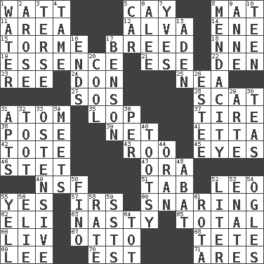 ACROSS 1. Electrical Unit 5. Island 8. Floor protector 11. Length times width 12. Inventor's middle name 14. Compass dir. 15. Singer Mel 17. A special lineage 18. Compass dir. 19. Core 21. Compass dir. 22. Lair 23. To riddle 24. Spanish title 25. Teachers' org. 27. Distress signal 28. Leave at once 31. Smallest unit of an element 35. Trim (branches) 37. Become fatigued 38. Airs 39. Fish or hair follower 41. Singer James 42. Lug 43. Friend of Pooh 45. Sight organs 46. Proofreading order 47. Mouth or opening 49. Science/research agcy. 51. Bar bill 52. Lion 55. Affirmative reply 57. Big collection agency 60. Catching in a trap 62. Biblical high priest 63. Characterized by obscenity 65. Add up to 66. 54 in ancient Rome 67. "Beetle Bailey" pooch 68. Wig 69. Area sheltered from the wind 70. Eastern Standard Time (abbr.) 71. Ancient Greek god of war DOWN 1. Wetness 2. Came up 3. Laconic 4. Docile 5. Automobile 6. Toward shelter 7. Jacques Cousteau's middle name 8. Ananias' fault 9. Queen of England 1702-14 10. Adolescent 13. An important port of Yemen 16. Conclusions 17. Gillaume's butler role 20. Calm and collected 26. First name in cosmetics 29. Johnson of "Laugh-In" 30. Afternoon social gatherings 31. Flats, for short 32. A blast of a horn 33. Clearly or manifestly demonstrative 34. Confronts 36. For each 40. Tootsie (variant) 44. NW Algerian seaport 48. Blind as ____ 50. Fine (Spanish) 52. 61 cubic inches 53. Maternal 54. Stares 55. Shout 56. Writer Wiesel 58. Pace 59. Fast planes 61. Round or rotation of duties 64. Small child