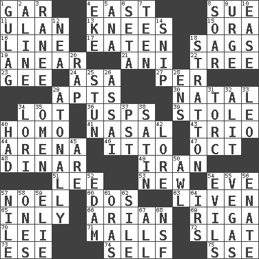 ACROSS 1. Slender fish 4. Compass direction 8. Institute legal proceedings 11. Uhlan (variant) 13. Leg joints 15. Mouth or opening 16. Actor's bit 17. Ingested 18. Settles 19. Approach 21. Cuckoo 22. Family _ (genealogy) 23. Turn to the right 24. White ___ sheet 27. For each 29. Tenement units (abbr.) 30. Relating to or accompanying birth 34. Car dealer's back yard 36. United States Postal Service (abbr.) 39. Fur scarf 40. Like (prefix) 41. Relating to the nose 43. Musical group of three 44. Sports stadium 46. "Tell ____ the Marines!" 47. Sep. follower 48. Middle Eastern gold or silver currency 49. SW Asia republic 51. Area sheltered from the wind 53. ___ Haven, CT 54. Night before a holiday 57. Christmas carol 60. Two (Sp.) 63. Make or become more lively 65. In an inward manner 66. Believer in; advocate of (suffix) 69. Capital of Latvia 70. Luau accessory 71. Promenades 72. Narrow board 73. Compass dir. 74. Automatically 75. Compass dir. DOWN 1. POW camp 2. Place in a line 3. The wife of a rajah (variant) 4. Make supply last 5. Santa ___, CA 6. Bristle 7. Adolescent 8. Fly high 9. Goad 10. Comfort 12. Teachers' org. 14. Sever or remove by pinching or nipping 18. Ski resort town in Vermont 20. Reproach for some lapse or misdeed 25. Astound 26. Slender Brazilian palm 28. Followers of ems 29. Lacking a tonal center or key 31. Torque (variant) 32. Came down and settled, as after flight 33. Lion 34. Australian parrot (variant) 35. Sign of things to come 37. Pacific Standard Time (abbr.) 38. Smooth fabric 40. Possessed 42. Old wives' tales, e.g. 45. "We ___ not amused" (Victoria) 50. Leather borer 52. Dutch treat 54. Vices 55. Viva Las _ 56. Related on the mother's side 57. Mediterranean tributary 58. Washington bills 59. Writer Wiesel 61. Mouths or openings 62. Filth; sediment 64. Big collection agency 67. 100% 68. Overdraft (abbr.)