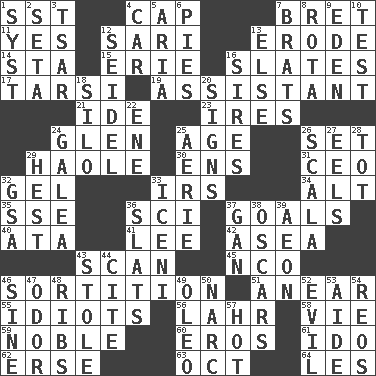 ACROSS 1. Fast jet (abbr.) 4. Head covering 7. Cy Young winner Saberhagen 11. It is so 12. Indian skirt 13. Eat (away) 14. R.R. building 15. One of the Great Lakes 16. Chalkboards 17. Tarsus (plural) 19. Helper 21. Binary compound 23. Angers 24. Small, secluded valley 25. Ripen 26. Arrange properly for use 29. White Person, in Hawaii 30. Followers of ems 31. Corporate head (abbr.) 32. Set 33. Big collection agency 34. The first octave above the treble staff 35. Compass dir. 36. _-fi 37. Scores awarded for successful feats 40. "One Day ___ Time" 41. Area sheltered from the wind 42. At sea 43. Glance over 45. Non-commissioned officer (abbr.) 46. Drawing lots 51. Approach 55. Foolish or stupid persons 56. Cowardly lion portrayer 58. Compete 59. Impressive in appearance 60. Greek god of love 61. Wedding promise 62. Celtic language 63. Sep. follower 64. French article DOWN 1. System (abbr.) 2. Stalk of a moss capsule 3. Russian ruler of old 4. Automobile 5. Operatic vocal solo 6. Sliced desserts 7. Naughty children 8. Round or rotation of duties 9. Paradise 10. Trial 12. Beer mug 13. Otherwise 16. Male parents of animals 18. Grain storage tower 20. Public displays of written messages 22. Compass dir. 24. An organ shaped like a helmet 25. Nest on high 26. Any of the three canals of the cochlea 27. Snakelike fish 28. Small child 29. Behest 32. Girls' org. (abbr.) 33. Ancient Celtic tribe of eastern Britain 36. Narrow boards 37. Separate the seeds from cotton 38. Motion picture awards 39. A really long time 43. Fur scarf 44. Quote 46. Trig term 47. Scent 48. Teases 49. Butter sub 50. Drug cop 52. Tending to cause great harm 53. Assistant 54. Vintage cars 57. Being at a high temperature