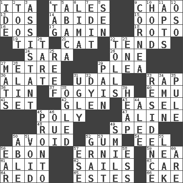 ACROSS 1. Call ___ day 4. Stories 9. US Secretary of Labor Elaine L. _ 13. Two (Sp.) 14. Remain 15. I made a mistake 16. Greek goddess of the dawn 17. Homeless child 18. Printing process, for short 19. Teat (slang) 21. Domesticated feline 22. Looks after 24. "Two Mules for Sister ____" 26. Single 27. Distance measurement (Brit.) 29. Entreaty 30. Having winglike extensions 31. Freehold land 33. Reproach for some lapse or misdeed 36. Metal container 37. Out of fashion; old fashioned 40. Australian flightless bird 41. Arrange properly for use 42. Small, secluded valley 43. Artist's stand 45. More than one (prefix) 47. Place in a line 48. Sorrow 49. Drove too fast 50. Shun 52. Chewing product 54. Snakelike fish 56. Inky black, to poets 57. Bert's buddy 59. Teachers' org. 61. Came down and settled, as after flight 62. Travels by water 63. Automobile 64. Redecorate 65. _____ Park, CO 66. Supplement with great effort DOWN 1. Binary compound 2. A blast of a horn 3. Aide 4. Label 5. Phillipine bananalike plant 6. Pale green bean 7. Prepare for publication 8. Elected rep. 9. Pupil covering 10. Parka part 11. Flats, for short 12. Bear (Spanish) 20. Small pie 22. For Whom the Bell _____ 23. Compass dir. 25. Coral collection 27. Floor coverings 28. Writer Wiesel 29. Ache 31. Repulsive 32. Color 33. Home 34. So be it 35. Whimper 38. Stared 39. Pile 44. Toward shelter 45. Right away 46. Fr. "Yes" 49. Grin 50. Competent 51. State of nonexistence 52. Pate de foie ____ 53. A single undivided whole 55. Path through which fluid escapes 56. Hearing organ 57. Compass dir. 58. Double-curved letter 60. "We ___ not amused" (Victoria)