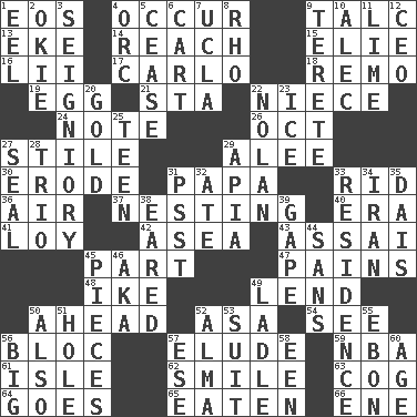 ACROSS 1. Greek goddess of the dawn 4. Come to pass 9. Baby powder 13. Make supply last 14. Arrive at 15. Writer Wiesel 16. Cards in a Roman deck? 17. Monte _, Las Vegas Hotel/Casino 18. San ____ (Riviera town) 19. Ovum 21. R.R. building 22. Sibling's daughter 24. Brief written record 26. Sep. follower 27. Vertical member of a panel or frame 29. Toward shelter 30. Eat (away) 31. Dad 33. To free from 36. Atmosphere 37. Nestling 40. Epoch 41. Myrna of the movies 42. At sea 43. Slender Brazilian palm 45. Role in a play 47. Aches 48. Mamie's mate 49. Grant temporary use of 50. At or in the front 52. White ___ sheet 54. Observe 56. Coalition 57. Evade 59. Basketball assoc. 61. Capri or Wight 62. Grin 63. Gear tooth 64. Moves 65. Consumed 66. Compass dir. DOWN 1. Snakelike fish 2. Migrant worker of the '30s 3. Signiory (variant) 4. The grampus (Milton) 5. Stop 6. Draw slowly or heavily 7. Southern CA. univ. 8. 17th letter of the Greek alphabet 9. Cylindrical with tapered ends 10. Actor Baldwin 11. Citrus frut 12. Corporate head (abbr.) 20. Precious metal 22. Pitcher Ryan 23. Frozen water 25. Adolescent 27. Lick closed 28. Musical group of three 29. Capital of Western Samoa 31. Inconspicuous attention getter 32. Had dinner 33. Home 34. SW Asia republic 35. Raised platform 38. Having ears or earlike features 39. Open wide 44. Without 45. Components 46. Alias (abbr.) 49. Dipping utensil 50. In addition 51. Hollow 52. _ mater 53. Set of matching outer garments 55. Inky black, to poets 56. Of large size 57. Compass dir. 58. Car or cant ending 60. Mature