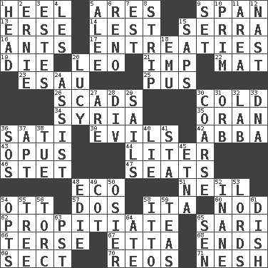 ACROSS 1. The bottom of a shoe or boot 5. Ancient Greek god of war 9. Connect, as a bridge 13. Celtic language 14. For fear that 15. Spanish missionary in California 16. Pismires 17. Pleas 19. Pass on 20. Lion 21. Naughty child 22. Floor covering 23. Son of Isaac 25. Product of festering 26. Tons 30. Chilled 34. Damascus' land 35. NW Algerian seaport 36. Suttee (variant) 39. Vices 42. Swedish rock group 43. Musical composition 44. 61 cubic inches 46. Proofreading order 47. Theater features 48. Environmental prefix 51. Famous astronaut Armstrong 54. Baseball player Mel 57. Two (Sp.) 58. Call ___ day 60. Lower and raise head in agreement 62. Appease 65. Indian skirt 66. Laconic 67. Singer James 68. Conclusions 69. Religious group 70. Vintage cars 71. Delicate DOWN 1. Froth on beer 2. Bert's buddy 3. _____ Park, CO 4. French article 5. Toward shelter 6. Former U.S. Attorney General Janet 7. Eastern Standard Time (abbr.) 8. Long narrow piece of something 9. Arrange properly for use 10. Demure 11. Length times width 12. Political cartoonist Thomas 15. Plant excrements 18. Australian flightless bird 20. "I Love _" 24. Help 27. "We ___ not amused" (Victoria) 28. HTML Container Element 29. Travels by water 30. Rough 31. Globe 32. Experiment locale 33. Heredity factor (abbr.) 36. Mayday 37. Fitting 38. Third day of the wk. 40. Untruth 41. R.R. building 45. Inactive volcano in Sicily 48. Singer Brickell 49. Small bed 50. Flexible twig of a willow tree 52. Silly 53. Titled peers of a realm 54. Elects 55. Family _ (genealogy) 56. Torque (variant) 58. "Tell ____ the Marines!" 59. Afternoon social gatherings 61. Food container 63. Pacific Standard Time (abbr.) 64. Had dinner 65. Elected rep.