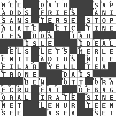 ACROSS 1. Born 4. Pledge 8. Plant excrement 11. Sums up 13. Strips of potato fried in deep fat 15. Black tropical American cuckoo 16. Without 17. Laconic 18. Halt 19. Having winglike extensions 21. And so on (abbr.) 22. Prong on a fork 23. French article 24. Two (Sp.) 27. The 19th letter of the Greek alphabet 29. Small island 30. Perfect 34. Raised railways 36. Allows 39. Haggard of country music 40. Give off 41. Goodbye (Sp.) 43. "Death on the ____" 44. Having threads 46. Shout 47. Beverage made from leaves 48. Heavy duty weighing machine 49. Raised platform 51. Benjamin's nick name 53. Baseball player Mel 54. Mouth or opening 57. Shade of tan 60. Erode 63. Debunk (Brit. slang) 65. Spoken 66. Feeling or showing extreme anger 69. Trig term 70. Fish or hair follower 71. Arboreal primate 72. Adolescent 73. Perceive with the eye 74. At sea 75. Arrange properly for use DOWN 1. Relating to the nose 2. Peak District village in England 3. Ferber et al. 4. Often (poetically) 5. "We ___ not amused" (Victoria) 6. Become fatigued 7. Behest 8. Suttee (variant) 9. Soon (poet.) 10. Corncob 12. Fast jet (abbr.) 14. Religious group 18. SAT takers 20. Begley and Asner 25. Rounded earthenware pot or jar 26. Shabby and untidy 28. Direct toward a target or goal 29. Byzantium, centuries later 31. 4th largest of the Great Lakes 32. Silent film actress Nazimova 33. Area sheltered from the wind 34. Arab leader 35. _ and Stitch 37. Make a knot 38. Twentieth part of a lira 40. Lizard (obsolete) 42. Narrow board 45. To riddle 50. It would 52. Famous astronaut Armstrong 54. Off-Broadway awards 55. Indian princess (variant) 56. Rep 57. Immeasurably long periods of time 58. Algonquian 59. Assign a rank or rating to 61. Type of rug 62. Scottish caps 64. Eastern Standard Time (abbr.) 67. Third day of the wk. 68. Epoch