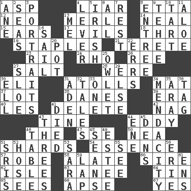 ACROSS 1. Viper 4. One who doesn't tell the truth 8. Singer James 12. Modern: prefix 13. Haggard of country music 14. Anneal 15. Hearing organs 17. Vices 18. Through, poetically 19. Paper fasteners 21. Cylindrical with tapered ends 23. _ de Janeiro 24. 17th letter of the Greek alphabet 26. To sift 27. Table seasoning 28. Past tense of be (plural) 30. Connecticut Ivy Leaguer 31. Ringlike coral islands and reefs 34. Floor covering 37. Car dealer's back yard 38. Natives or inhabitants of Denmark 39. Epoch 40. French article 41. Keyboard key 42. Tired old horse 43. Prong on a fork 44. Whirlpool 46. Definite Article 47. Compass dir. 50. Teachers' org. 51. Broken pieces 54. Center 57. Loose flowing garment 58. Having winglike extensions 60. Title for a man of rank and authority 62. Small island 63. The wife of a rajah (variant) 64. Shallow baking pan 65. Perceives with the eye 66. Domed church section 67. It is so DOWN 1. One (Scot) 2. Oceans 3. Likenesses of persons 4. Crowbar 5. From or relating to Ireland 6. 100% 7. Relief 8. Main course 9. Giggle 10. Small pie 11. _ vera 13. Cartoonist voice _ Blanc 16. Travel by water 20. Plant holder 22. Blunders 25. A small or young owl 27. A type of plum 29. Otherwise 30. Pipe bend 31. Arabian gulf 32. Stories 33. Single 34. Ananias' fault 35. Like ___ of sunshine 36. Label 41. Passed on 43. Threesomes 44. Compass dir. 45. Habitations of wild animals 46. Eating place 48. Actors Connery and Penn 49. First name in cosmetics 51. Indian titles of respect 52. Stockings 53. "Two Mules for Sister ____" 55. Perceive with the eye 56. 4th largest of the Great Lakes 59. Pet locale 61. Followers of ems