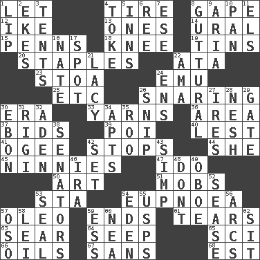 ACROSS 1. Allow 4. Become fatigued 8. Stare wonderingly 12. Mamie's husband 13. Singles 14. Mountain range 15. Actor Sean's family 18. Leg joint 19. Canisters 20. Paper fasteners 22. _ moment's notice (2 wds.) 23. Portico 24. Australian flightless bird 25. And so on (abbr.) 26. Catching in a trap 30. Epoch 33. Tall tales 36. Type of rug 37. Auction offers 39. Luau course 40. For fear that 41. Double curve, resembling the letter S 42. Closes up, plugs up 44. A female animal or person 45. Simpletons 47. Wedding promise 50. Nonscientific branch of learning 51. Disorderly crowds 53. R.R. building 54. Normal relaxed breathing 57. Margarine 59. Extremities 61. Rends 63. Shrivel 64. Ooze 65. _-fi 66. Lubricates 67. Without 68. Eastern Standard Time (abbr.) DOWN 1. Mouth edge 2. Makes supply last 3. Portable shelters 4. Casino tip 5. Restaurants 6. To riddle 7. Compass dir. 8. From the throat 9. Operatic vocal solo 10. Baking dish 11. Raised railways 16. Nathan's nickname 17. Specific locale 21. Made of lace 22. Wet nurse (var.) 24. Followers of ems 26. Sever or remove by pinching or nipping 27. Angers 28. Delicate 29. Yard entry 30. Inky black, to poets 31. Swiss mountan, "Queen of the Mountains" 32. Arabian gulf 34. Flats, for short 35. Friend of Pooh 38. Legislators 42. Put into a specified state 43. Simple or foolish person 46. Lyricist Gershwin 48. Do not 49. Mitch Miller's instrument 52. Gospel singer Marvin 53. Lick closed 54. Paradise 55. United States Postal Service (abbr.) 56. Arches 57. Bear (Spanish) 58. Flowery wreath 59. Curvy letter 60. Teachers' org. 62. Be seated