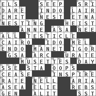 ACROSS 1. Raised railways 4. Ooze 8. Indian title of respect (Mr.) 11. Have the gumption 13. Southeast Asian peninsula 14. Den 15. Give off 16. Egg locale 17. Inactive volcano in Sicily 18. Snuggling 21. Robbery 22. Queen of England 1702-14 23. White ___ sheet 25. Born 26. Everything 29. One of the two male reproductive glands 32. Capital of Egypt 34. Wedding promise 35. Cartoonist voice _ Blanc 38. Inside; within (prefix) 39. French painter Edouard 41. Russian composer Stravinsky 43. Girls' org. (abbr.) 44. Curve 45. A salt of uric acid 46. French bagpipes 50. 24 hours 51. Compass dir. 54. R.R. building 55. I made a mistake 57. Desist 59. Stimulate to action 63. Pace 64. 1994 drama film starring Jodie Foster 67. Operatic vocal solo 68. Toward the sea 69. Writer Wiesel 70. Confederate soldiers (slang) 71. Commissioned military rank (abbr.) 72. Came down and settled, as after flight 73. Fast jet (abbr.) DOWN 1. Paradise 2. Unable to walk 3. Indian titles of respect 4. Burns superficially 5. Compass dir. 6. Begley and Asner 7. Plant holder 8. Smooth fabric 9. Remove soap 10. Feeling or showing extreme anger 12. Singer James 14. Area sheltered from the wind 19. To the inside or interior of 20. Compass dir. 21. Actor Linden 23. Assistant 24. Highlander 26. Adept person 27. Long (Scottish) 28. Hats (slang) 30. A color or tint 31. Independent ruler or chieftain 33. Wander 36. Mild oath 37. Globular water bottle used in Asia 39. Vertical spar for supporting sails 40. Type of rug 42. Marina Del _, California 45. United States Postal Service (abbr.) 47. Purpose 48. Bathroom plumbing fixture 49. A really long time 51. Lean end of the neck 52. Gospel singer Marvin 53. Consumed 56. Coast Guard woman 58. Ocean 60. Angers 61. Chest bones 62. 90 degrees 64. Teachers' org. 65. Pipe bend 66. Cards in a Roman deck?