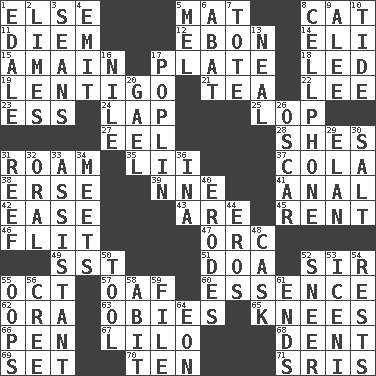 ACROSS 1. Otherwise 5. Floor protector 8. Domesticated feline 11. South Vietnam president (1954) 12. Inky black, to poets 14. Biblical high priest 15. With great haste 17. Food holder 18. Directed 19. Small, flat, pigmented spot on the skin 21. Beverage made from leaves 22. Area sheltered from the wind 23. Curvy letter 24. Pet locale 25. Chop off 27. Snakelike fish 28. "______ My Girl" (Turtles hit) 31. Wander aimlessly 35. Cards in a Roman deck? 37. Root beer relative 38. Celtic language 39. Compass dir. 41. Of or related to the anus 42. Relaxation 43. "We ___ not amused" (Victoria) 45. Monthly bill 46. Secret move to avoid paying debts 47. The grampus (Milton) 49. Fast jet (abbr.) 51. ___ good deed 52. Title for a knight 55. Sep. follower 57. Clumsy lout 60. Gist 62. Mouth or opening 63. Off-Broadway awards 65. Leg joints 66. Animal enclosure 67. _ and Stitch 68. Gouge 69. Arrange properly for use 70. Nine, plus one 71. Indian titles of respect DOWN 1. Peak District village in England 2. Citrus fruits 3. Actors Connery and Penn 4. Give off 5. Cartoonist voice _ Blanc 6. Blind as ____ 7. Carryall 8. Portable communications device 9. Toward shelter 10. Event that recurs at intervals 13. Anneal 16. Mediterranean tributary 17. Cotton for raincoats, e.g. 20. Highlander 26. Witty Wilde 29. Enthusiasm 30. Table seasoning 31. Coral collection 32. Relating to the mouth 33. Aide 34. Confronts 36. _ tizzy (2 wds.) 40. Eats (away) 44. Greek god of love 48. Keg 50. Instrument 52. Scornful expression 53. Ancient Celtic tribe of eastern Britain 54. Musical pauses 55. I made a mistake 56. Algonquian 58. "This won't hurt ____!" 59. Do some clerical work 61. Extremities 64. A really long time