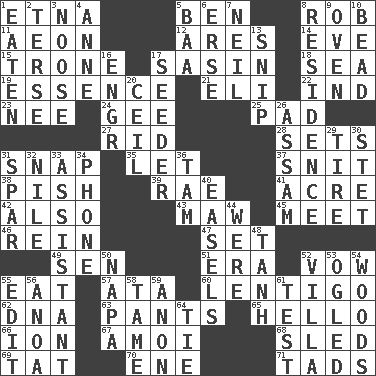 ACROSS 1. Inactive volcano in Sicily 5. Benjamin's nick name 8. Director Reiner 11. A really long time 12. Ancient Greek god of war 14. Night before a holiday 15. Marketplace scale 17. Indian antelope 18. Ocean 19. Center 21. Connecticut Ivy Leaguer 22. Working for oneself (abbr.) 23. Born 24. Unit of force equal to gravity 25. Writing tablet 27. To free from 28. Arranges properly for use 31. Fastener 35. Allow 37. In a ____ (agitated or irritated) 38. Expression of disdain 39. Actress Charlotte 41. Measure of real estate 42. In addition 43. Opening into something insatiable 45. Confront 46. It's straight from the horse's mouth 47. Put into a specified state 49. Elected rep. 51. Epoch 52. Solemn pledge 55. Ingest 57. "One Day ___ Time" 60. Small, flat, pigmented spot on the skin 62. Heredity factor (abbr.) 63. Leg coverings 65. Phone greeting 66. Electrically charged atom 67. Mine, in Marseilles 68. Downhill vehicle 69. Make lace 70. Compass dir. 71. Small amounts or degrees DOWN 1. Eroded 2. Laconic 3. Trap for birds or small mammals 4. Singer Murray 5. Sound made by sheep 6. Celtic language 7. Famous astronaut Armstrong 8. Dwelling 9. Baking chamber 10. Necklace unit 13. Clip 16. Engineer (abbr.) 17. Sowing specialist 20. To provide with a ceiling 26. Indian state 29. Become fatigued 30. Proofreading order 31. Practice fight 32. Mediterranean tributary 33. Helper 34. Give a jingle 36. Scottish cap 40. Artist's stands 44. Past tense of be (plural) 48. Hyperbolic tangent 50. California wine valley 52. Country residence 53. Stared at amorously 54. Forest 55. Prepare for publication 56. Small Philippine buffalo 58. Not wild 59. Soon (poet.) 61. Trial 64. Standoff