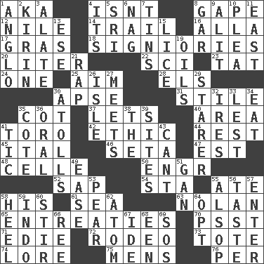 ACROSS 1. Alias (abbr.) 4. Is not 8. Stare wonderingly 12. Mediterranean tributary 14. Get behind 16. Silent film actress Nazimova 17. Pate de foie ____ 18. Seigniories (variant) 20. 61 cubic inches 22. _-fi 23. Make lace 24. Single 25. Direct toward a target or goal 28. Raised railways 30. Domed church section 31. Vertical member of a panel or frame 35. Small bed 37. Allows 40. Type of rug 41. "Corrida" creature 42. Moral principle 44. Take ten 45. Slanted text style (abbr.) 46. Stalk of a moss capsule 47. Eastern Standard Time (abbr.) 48. Cell (Danish) 50. Engineer (abbr.) 52. Plant excrement 54. R.R. building 55. Had dinner 58. Part of HMS, perhaps 61. Ocean 63. Pitcher Ryan 65. Pleas 70. Inconspicuous attention getter 71. Singer Brickell 72. Cowboy competition 73. Haul 74. Old wives' tales, e.g. 75. Not women's 76. For each DOWN 1. White American of non-Hispanic descent 2. Japanese brewing company 3. Having winglike extensions 4. It is 5. _ Lanka 6. Tired old horse 7. Metal containers 8. Slender fish 9. Came down and settled, as after flight 10. Entreaty 11. 90 degrees 13. Compass dir. 15. Louse (plural) 19. Lubricates 21. Reproach for some lapse or misdeed 26. Small island 27. Confronts 29. A viewer who gazes fixedly 30. Ringlike coral islands and reefs 32. Angers 33. For fear that 34. Consume 35. ____ d'Azur (French Riviera) 36. Of the mouth 38. Definite Article 39. Settings 41. Nervous spasm 43. Patter 49. Relaxation 51. Separate the seeds from cotton 53. Lightbulb-shaped fruit 55. Columnist Joseph or Stewart 56. Clothes sense 57. Keyboard key 58. The bottom of a shoe or boot 59. Southeast Asian peninsula 60. Commotion 62. Smallest unit of an element 64. Elect 66. To sift 67. Binary compound 68. Car or cant ending 69. Mayday